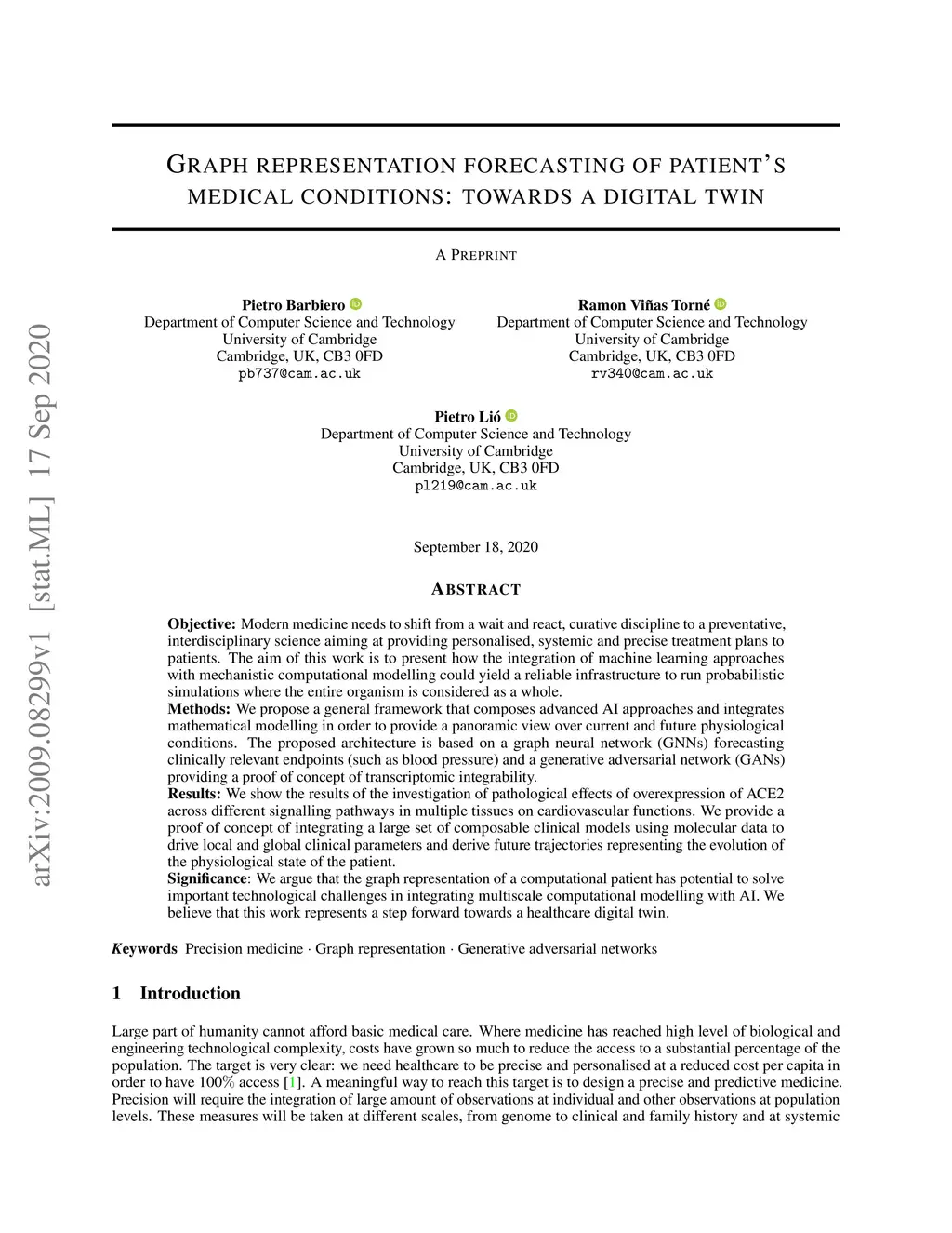 Objective: Modern medicine needs to shift from a wait and react, curative discipline to a preventative, interdisciplinary science aiming at providing personalised, systemic and precise treatment plans to patients. The aim of this work is to present how the integration of machine learning approaches with mechanistic computational modelling could yield a reliable infrastructure to run probabilistic simulations where the entire organism is considered as a whole. Methods: We propose a general framework that composes advanced AI approaches and integrates mathematical modelling in order to provide a panoramic view over current and future physiological conditions. The proposed architecture is based on a graph neural network (GNNs) forecasting clinically relevant endpoints (such as blood pressure) and a generative adversarial network (GANs) providing a proof of concept of transcriptomic integrability. Results: We show the results of the investigation of pathological effects of overexpression of ACE2 across different signalling pathways in multiple tissues on cardiovascular functions. We provide a proof of concept of integrating a large set of composable clinical models using molecular data to drive local and global clinical parameters and derive future trajectories representing the evolution of the physiological state of the patient. Significance: We argue that the graph representation of a computational patient has potential to solve important technological challenges in integrating multiscale computational modelling with AI. We believe that this work represents a step forward towards a healthcare digital twin.