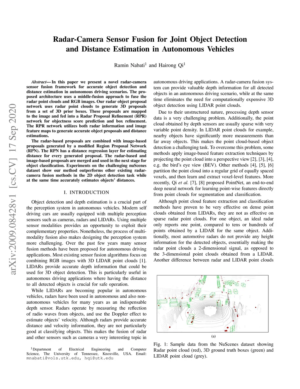 Radar-Camera Sensor Fusion for Joint Object Detection and Distance