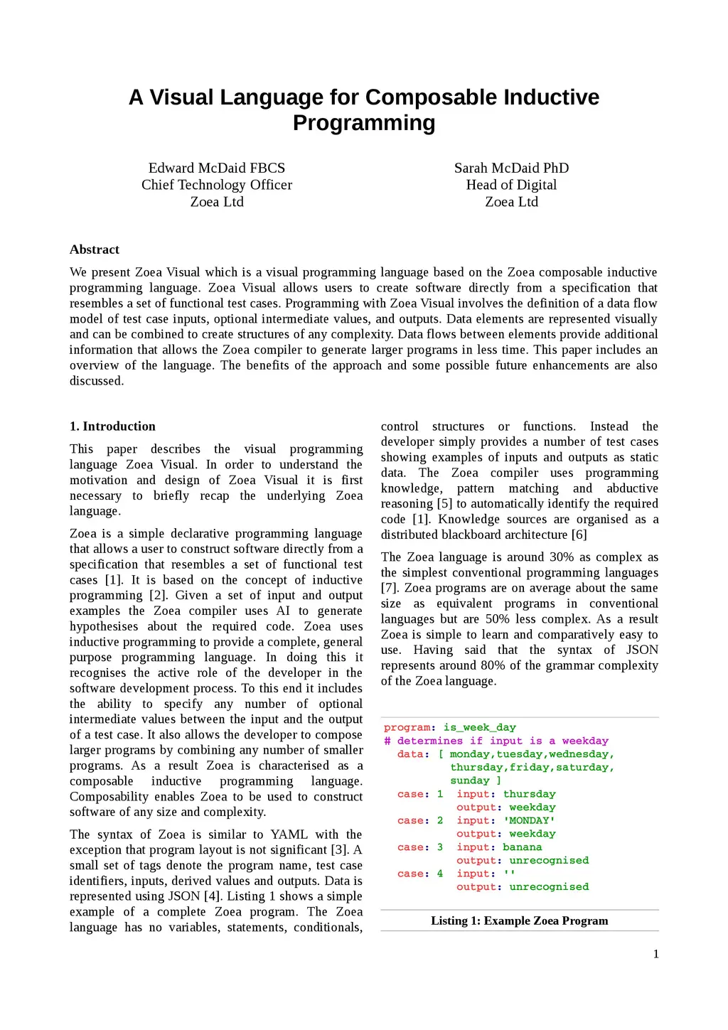 We present Zoea Visual which is a visual programming language based on the Zoea composable inductive programming language. Zoea Visual allows users to create software directly from a specification that resembles a set of functional test cases. Programming with Zoea Visual involves the definition of a data flow model of test case inputs, optional intermediate values, and outputs. Data elements are represented visually and can be combined to create structures of any complexity. Data flows between elements provide additional information that allows the Zoea compiler to generate larger programs in less time. This paper includes an overview of the language. The benefits of the approach and some possible future enhancements are also discussed.