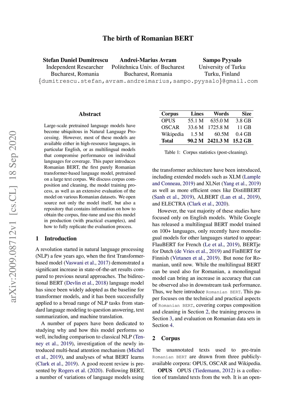 Large-scale pretrained language models have become ubiquitous in Natural Language Processing. However, most of these models are available either in high-resource languages, in particular English, or as multilingual models that compromise performance on individual languages for coverage. This paper introduces Romanian BERT, the first purely Romanian transformer-based language model, pretrained on a large text corpus. We discuss corpus composition and cleaning, the model training process, as well as an extensive evaluation of the model on various Romanian datasets. We open source not only the model itself, but also a repository that contains information on how to obtain the corpus, fine-tune and use this model in production (with practical examples), and how to fully replicate the evaluation process.