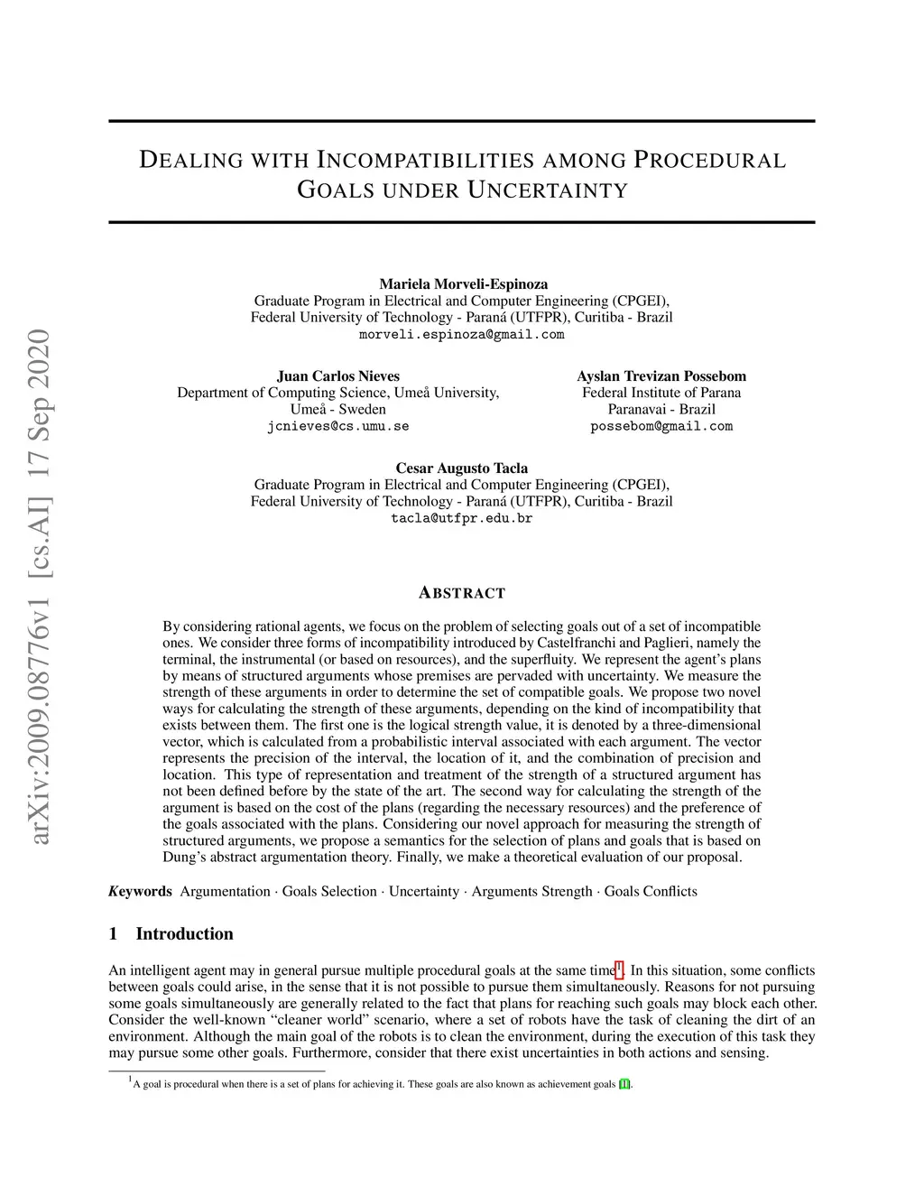 By considering rational agents, we focus on the problem of selecting goals out of a set of incompatible ones. We consider three forms of incompatibility introduced by Castelfranchi and Paglieri, namely the terminal, the instrumental (or based on resources), and the superfluity. We represent the agent's plans by means of structured arguments whose premises are pervaded with uncertainty. We measure the strength of these arguments in order to determine the set of compatible goals. We propose two novel ways for calculating the strength of these arguments, depending on the kind of incompatibility that exists between them. The first one is the logical strength value, it is denoted by a three-dimensional vector, which is calculated from a probabilistic interval associated with each argument. The vector represents the precision of the interval, the location of it, and the combination of precision and location. This type of representation and treatment of the strength of a structured argument has not been defined before by the state of the art. The second way for calculating the strength of the argument is based on the cost of the plans (regarding the necessary resources) and the preference of the goals associated with the plans. Considering our novel approach for measuring the strength of structured arguments, we propose a semantics for the selection of plans and goals that is based on Dung's abstract argumentation theory. Finally, we make a theoretical evaluation of our proposal.