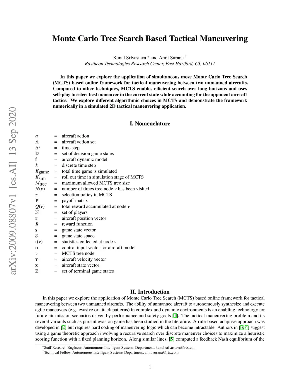 In this paper we explore the application of simultaneous move Monte Carlo Tree Search (MCTS) based online framework for tactical maneuvering between two unmanned aircrafts. Compared to other techniques, MCTS enables efficient search over long horizons and uses self-play to select best maneuver in the current state while accounting for the opponent aircraft tactics. We explore different algorithmic choices in MCTS and demonstrate the framework numerically in a simulated 2D tactical maneuvering application.