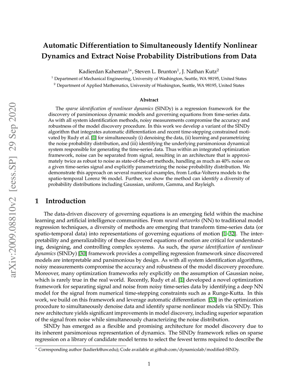 The sparse identification of nonlinear dynamics (SINDy) is a regression framework for the discovery of parsimonious dynamic models and governing equations from time-series data. As with all system identification methods, noisy measurements compromise the accuracy and robustness of the model discovery procedure. In this work, we develop a variant of the SINDy algorithm that integrates automatic differentiation and recent time-stepping constrained motivated by Rudy et al. for simultaneously (i) denoising the data, (ii) learning and parametrizing the noise probability distribution, and (iii) identifying the underlying parsimonious dynamical system responsible for generating the time-series data. Thus within an integrated optimization framework, noise can be separated from signal, resulting in an architecture that is approximately twice as robust to noise as state-of-the-art methods, handling as much as 40% noise on a given time-series signal and explicitly parametrizing the noise probability distribution. We demonstrate this approach on several numerical examples, from Lotka-Volterra models to the spatio-temporal Lorenz 96 model. Further, we show the method can identify a diversity of probability distributions including Gaussian, uniform, Gamma, and Rayleigh.