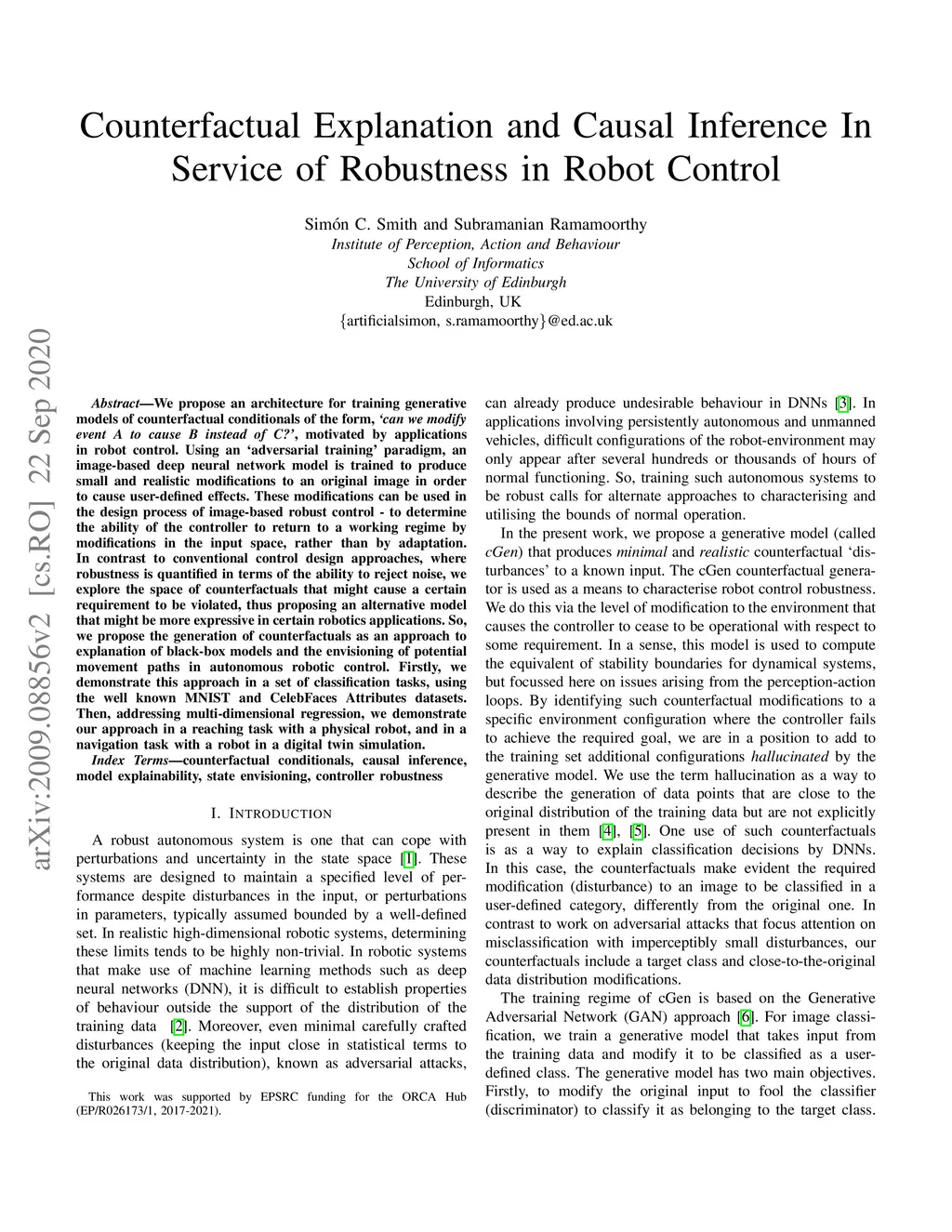 We propose an architecture for training generative models of counterfactual conditionals of the form, 'can we modify event A to cause B instead of C?', motivated by applications in robot control. Using an ádversarial training' paradigm, an image-based deep neural network model is trained to produce small and realistic modifications to an original image in order to cause user-defined effects. These modifications can be used in the design process of image-based robust control - to determine the ability of the controller to return to a working regime by modifications in the input space, rather than by adaptation. In contrast to conventional control design approaches, where robustness is quantified in terms of the ability to reject noise, we explore the space of counterfactuals that might cause a certain requirement to be violated, thus proposing an alternative model that might be more expressive in certain robotics applications. So, we propose the generation of counterfactuals as an approach to explanation of black-box models and the envisioning of potential movement paths in autonomous robotic control. Firstly, we demonstrate this approach in a set of classification tasks, using the well known MNIST and CelebFaces Attributes datasets. Then, addressing multi-dimensional regression, we demonstrate our approach in a reaching task with a physical robot, and in a navigation task with a robot in a digital twin simulation.
