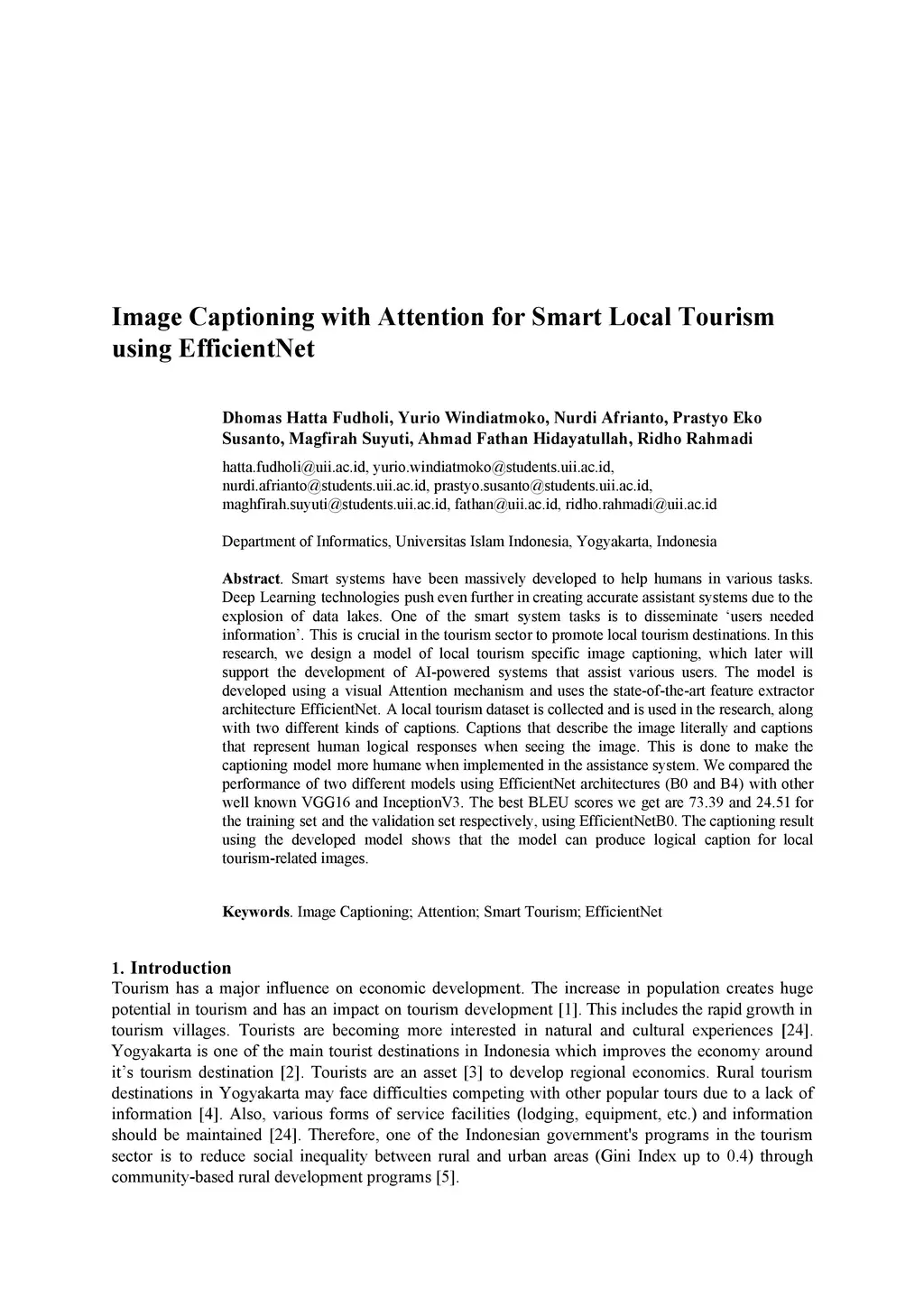 Smart systems have been massively developed to help humans in various tasks. Deep Learning technologies push even further in creating accurate assistant systems due to the explosion of data lakes. One of the smart system tasks is to disseminate users needed information. This is crucial in the tourism sector to promote local tourism destinations. In this research, we design a model of local tourism specific image captioning, which later will support the development of AI-powered systems that assist various users. The model is developed using a visual Attention mechanism and uses the state-of-the-art feature extractor architecture EfficientNet. A local tourism dataset is collected and is used in the research, along with two different kinds of captions. Captions that describe the image literally and captions that represent human logical responses when seeing the image. This is done to make the captioning model more humane when implemented in the assistance system. We compared the performance of two different models using EfficientNet architectures (B0 and B4) with other well known VGG16 and InceptionV3. The best BLEU scores we get are 73.39 and 24.51 for the training set and the validation set respectively, using EfficientNetB0. The captioning result using the developed model shows that the model can produce logical caption for local tourism-related images