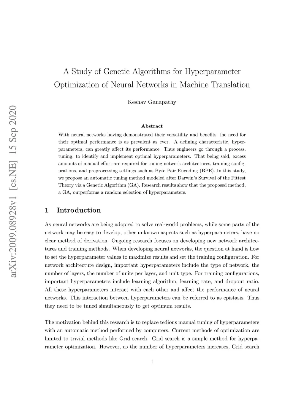 With neural networks having demonstrated their versatility and benefits, the need for their optimal performance is as prevalent as ever. A defining characteristic, hyperparameters, can greatly affect its performance. Thus engineers go through a process, tuning, to identify and implement optimal hyperparameters. That being said, excess amounts of manual effort are required for tuning network architectures, training configurations, and preprocessing settings such as Byte Pair Encoding (BPE). In this study, we propose an automatic tuning method modeled after Darwin's Survival of the Fittest Theory via a Genetic Algorithm (GA). Research results show that the proposed method, a GA, outperforms a random selection of hyperparameters.