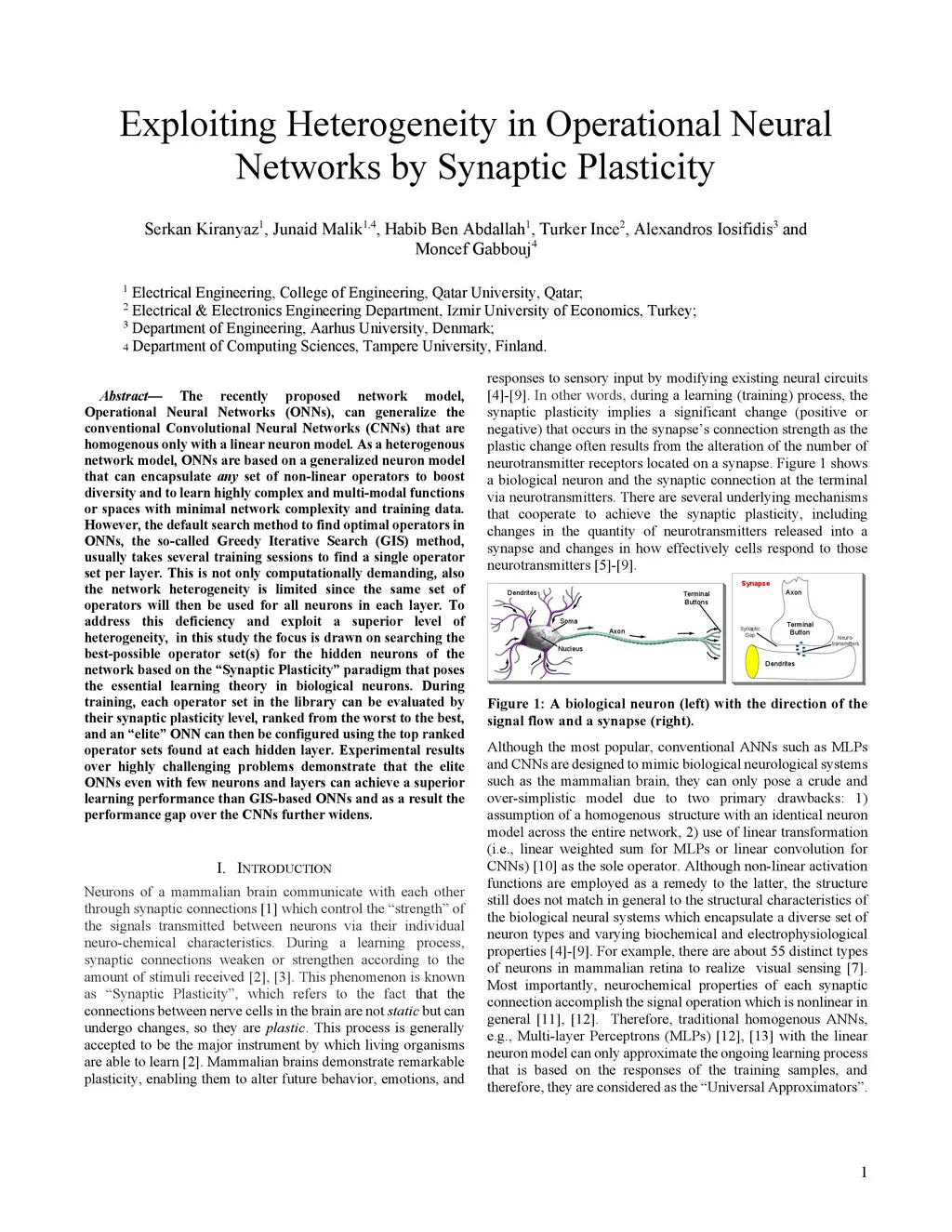 The recently proposed network model, Operational Neural Networks (ONNs), can generalize the conventional Convolutional Neural Networks (CNNs) that are homogenous only with a linear neuron model. As a heterogenous network model, ONNs are based on a generalized neuron model that can encapsulate any set of non-linear operators to boost diversity and to learn highly complex and multi-modal functions or spaces with minimal network complexity and training data. However, the default search method to find optimal operators in ONNs, the so-called Greedy Iterative Search (GIS) method, usually takes several training sessions to find a single operator set per layer. This is not only computationally demanding, also the network heterogeneity is limited since the same set of operators will then be used for all neurons in each layer. To address this deficiency and exploit a superior level of heterogeneity, in this study the focus is drawn on searching the best-possible operator set(s) for the hidden neurons of the network based on the Synaptic Plasticity paradigm that poses the essential learning theory in biological neurons. During training, each operator set in the library can be evaluated by their synaptic plasticity level, ranked from the worst to the best, and an elite ONN can then be configured using the top ranked operator sets found at each hidden layer. Experimental results over highly challenging problems demonstrate that the elite ONNs even with few neurons and layers can achieve a superior learning performance than GIS-based ONNs and as a result the performance gap over the CNNs further widens.