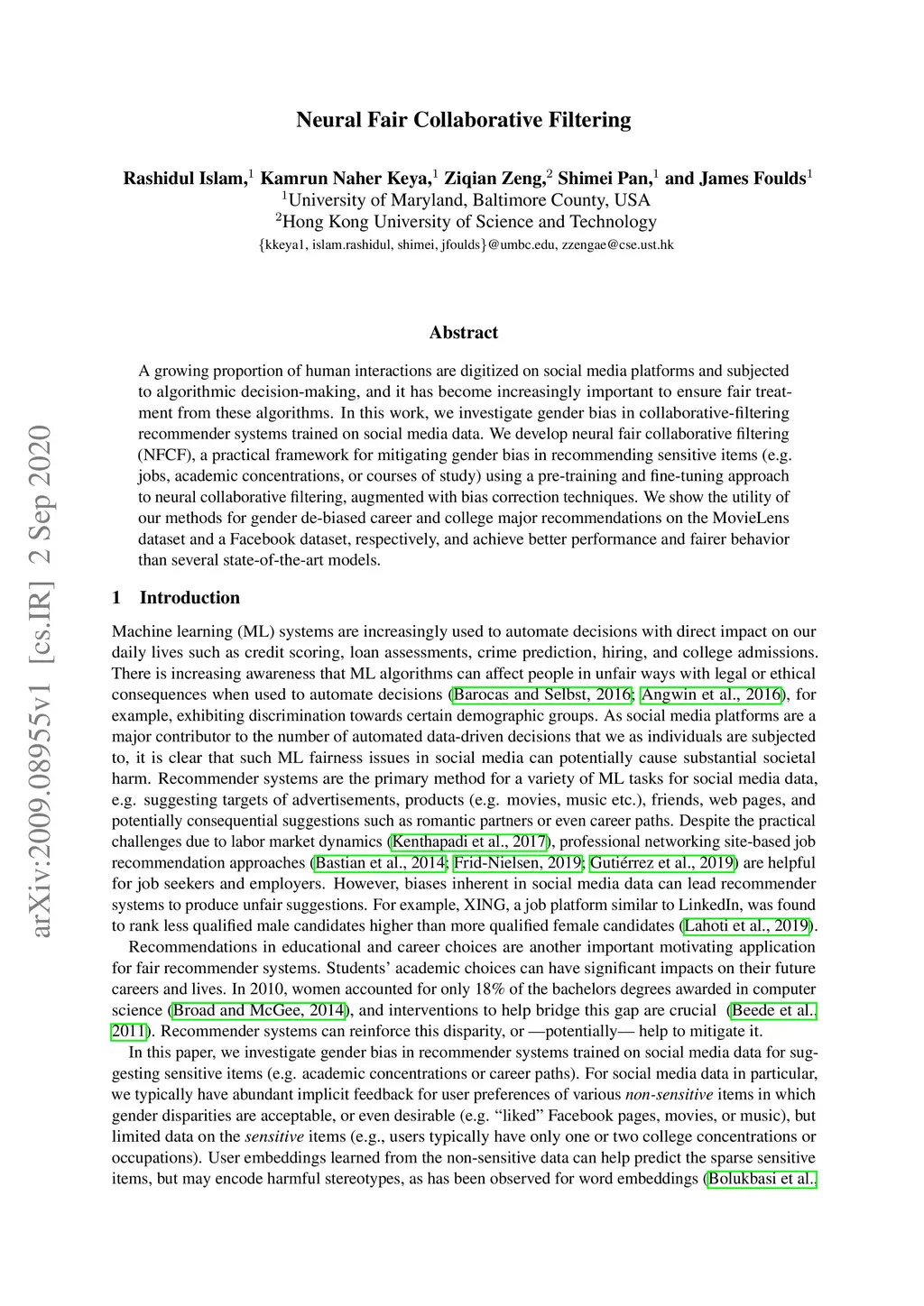 A growing proportion of human interactions are digitized on social media platforms and subjected to algorithmic decision-making, and it has become increasingly important to ensure fair treatment from these algorithms. In this work, we investigate gender bias in collaborative-filtering recommender systems trained on social media data. We develop neural fair collaborative filtering (NFCF), a practical framework for mitigating gender bias in recommending sensitive items (e.g. jobs, academic concentrations, or courses of study) using a pre-training and fine-tuning approach to neural collaborative filtering, augmented with bias correction techniques. We show the utility of our methods for gender de-biased career and college major recommendations on the MovieLens dataset and a Facebook dataset, respectively, and achieve better performance and fairer behavior than several state-of-the-art models.