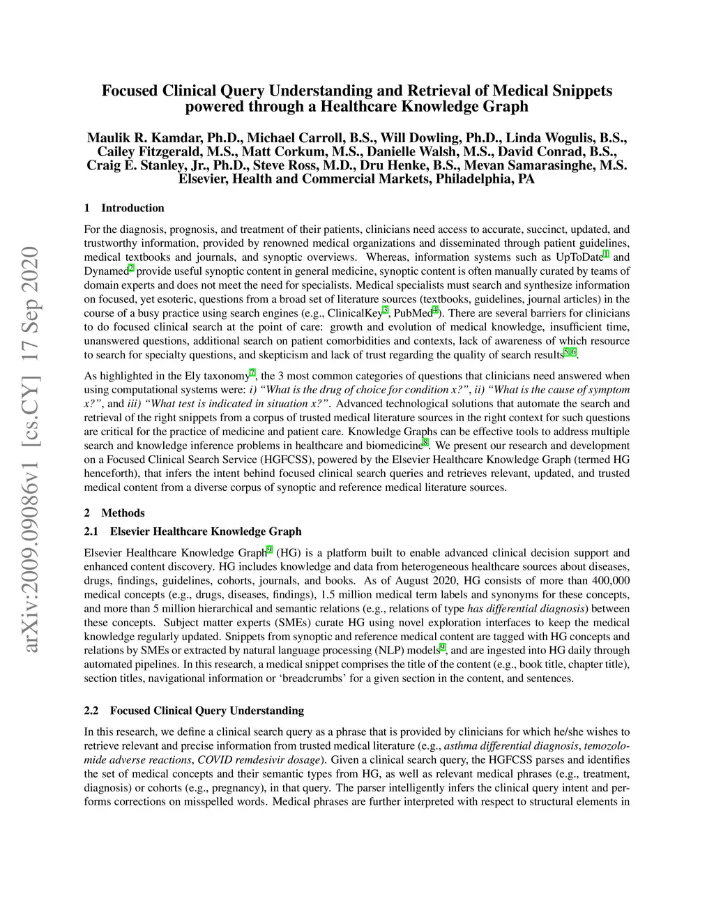 Clinicians face several significant barriers to search and synthesize accurate, succinct, updated, and trustworthy medical information from several literature sources during the practice of medicine and patient care. In this talk, we will be presenting our research behind the development of a Focused Clinical Search Service, powered by a Healthcare Knowledge Graph, to interpret the query intent behind clinical search queries and retrieve relevant medical snippets from a diverse corpus of medical literature.