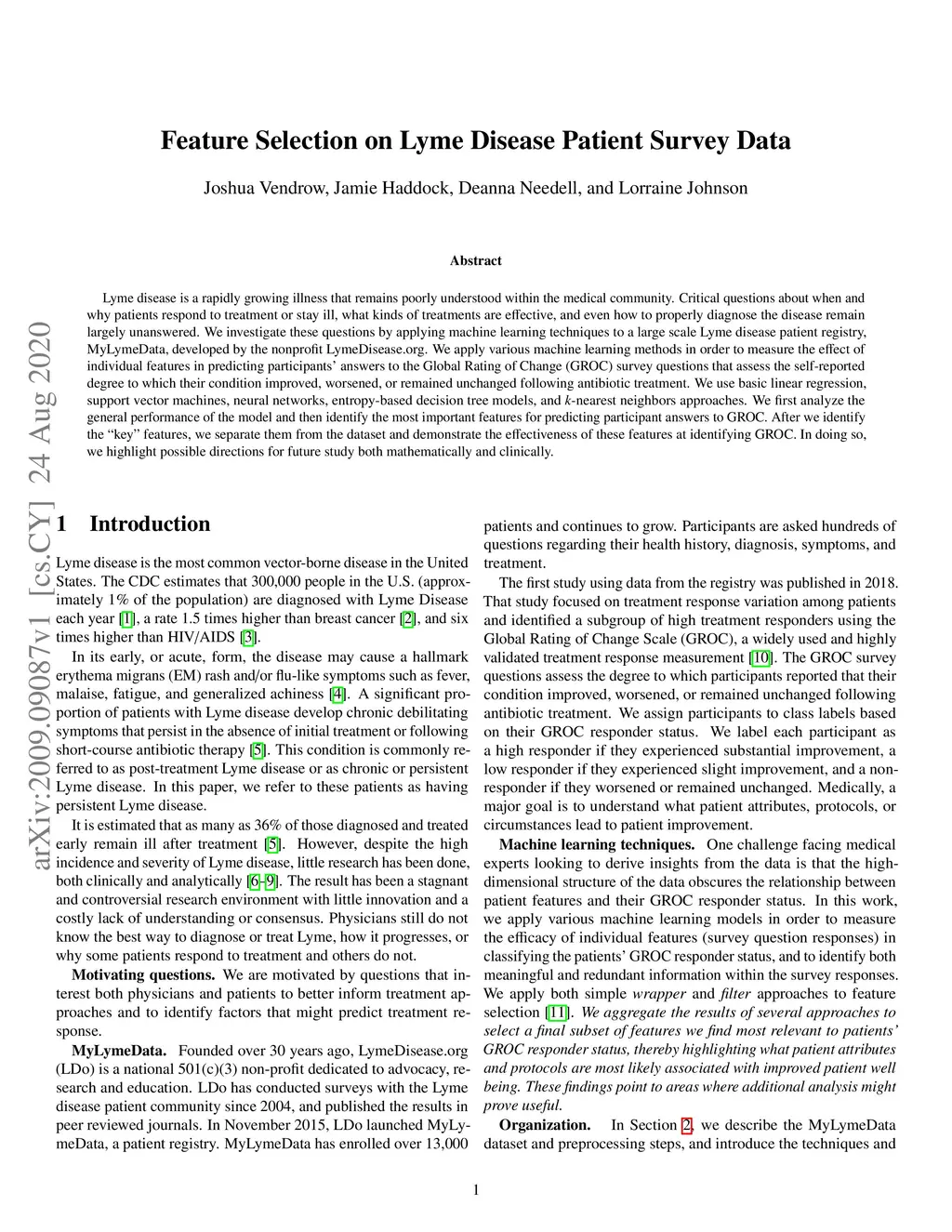 Lyme disease is a rapidly growing illness that remains poorly understood within the medical community. Critical questions about when and why patients respond to treatment or stay ill, what kinds of treatments are effective, and even how to properly diagnose the disease remain largely unanswered. We investigate these questions by applying machine learning techniques to a large scale Lyme disease patient registry, MyLymeData, developed by the nonprofit LymeDisease.org. We apply various machine learning methods in order to measure the effect of individual features in predicting participants' answers to the Global Rating of Change (GROC) survey questions that assess the self-reported degree to which their condition improved, worsened, or remained unchanged following antibiotic treatment. We use basic linear regression, support vector machines, neural networks, entropy-based decision tree models, and -nearest neighbors approaches. We first analyze the general performance of the model and then identify the most important features for predicting participant answers to GROC. After we identify the "key" features, we separate them from the dataset and demonstrate the effectiveness of these features at identifying GROC. In doing so, we highlight possible directions for future study both mathematically and clinically.