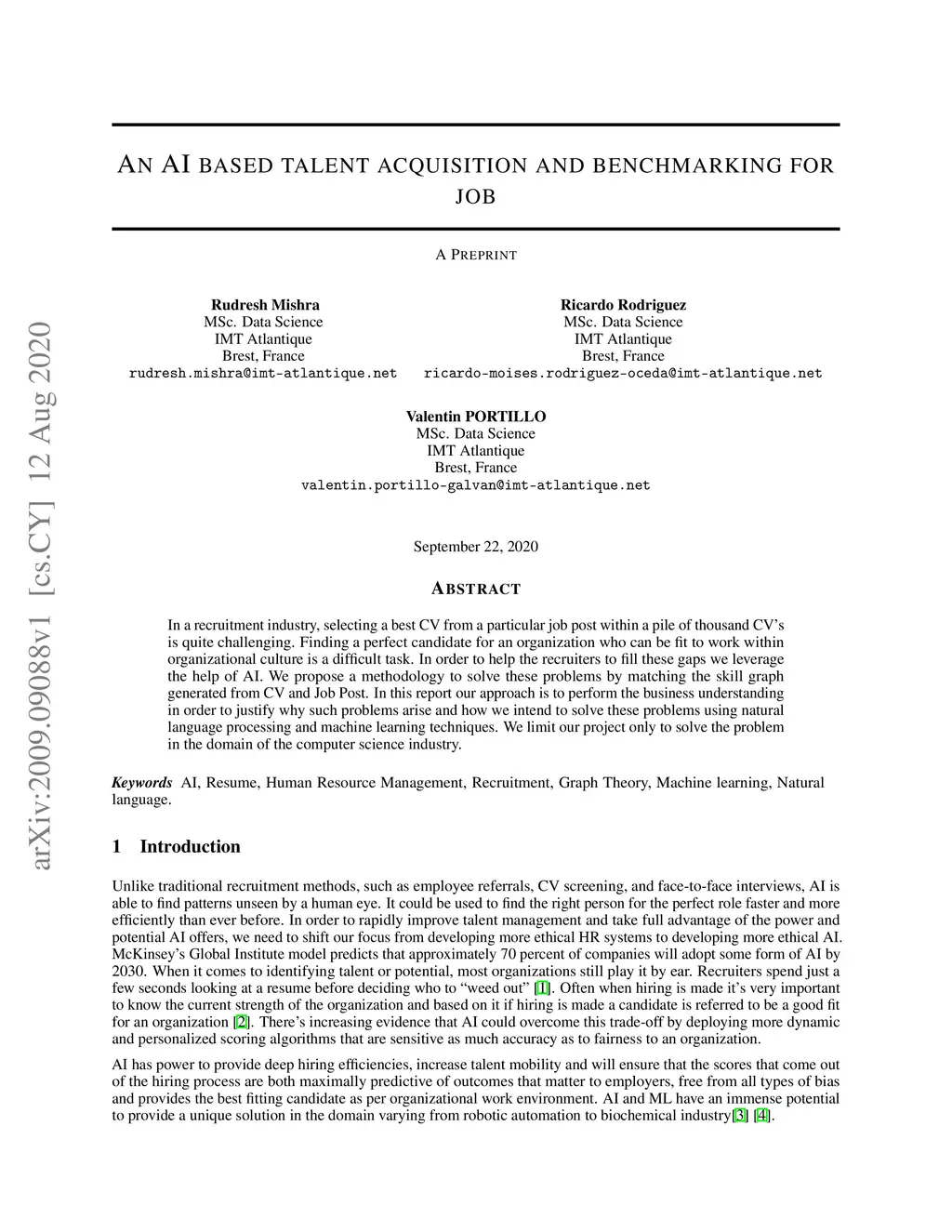 In a recruitment industry, selecting a best CV from a particular job post within a pile of thousand CV's is quite challenging. Finding a perfect candidate for an organization who can be fit to work within organizational culture is a difficult task. In order to help the recruiters to fill these gaps we leverage the help of AI. We propose a methodology to solve these problems by matching the skill graph generated from CV and Job Post. In this report our approach is to perform the business understanding in order to justify why such problems arise and how we intend to solve these problems using natural language processing and machine learning techniques. We limit our project only to solve the problem in the domain of the computer science industry.