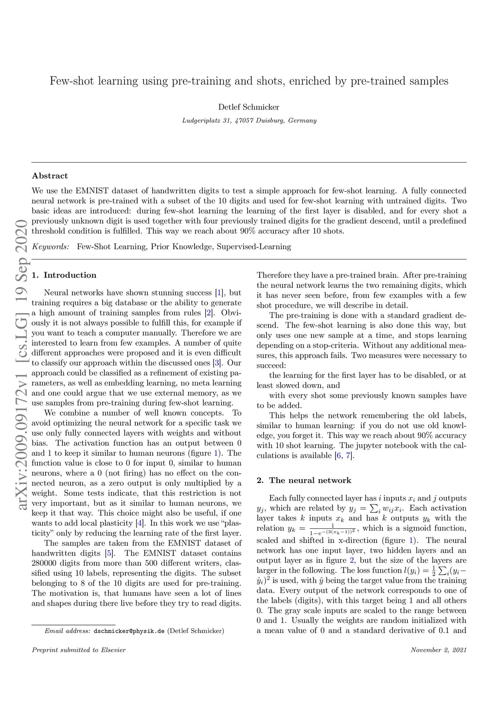 We use the EMNIST dataset of handwritten digits to test a simple approach for few-shot learning. A fully connected neural network is pre-trained with a subset of the 10 digits and used for few-shot learning with untrained digits. Two basic ideas are introduced: during few-shot learning the learning of the first layer is disabled, and for every shot a previously unknown digit is used together with four previously trained digits for the gradient descend, until a predefined threshold condition is fulfilled. This way we reach about 90% accuracy after 10 shots.