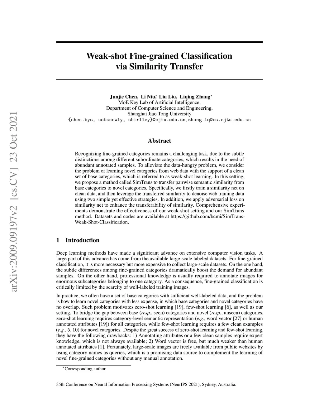Recognizing fine-grained categories remains a challenging task, due to the subtle distinctions among different subordinate categories, which results in the need of abundant annotated samples. To alleviate the data-hungry problem, we consider the problem of learning novel categories from web data with the support of a clean set of base categories, which is referred to as weak-shot learning. In this setting, we propose a method called SimTrans to transfer pairwise semantic similarity from base categories to novel categories. Specifically, we firstly train a similarity net on clean data, and then leverage the transferred similarity to denoise web training data using two simple yet effective strategies. In addition, we apply adversarial loss on similarity net to enhance the transferability of similarity. Comprehensive experiments demonstrate the effectiveness of our weak-shot setting and our SimTrans method. Datasets and codes are available at https://github.com/bcmi/SimTrans-Weak-Shot-Classification.