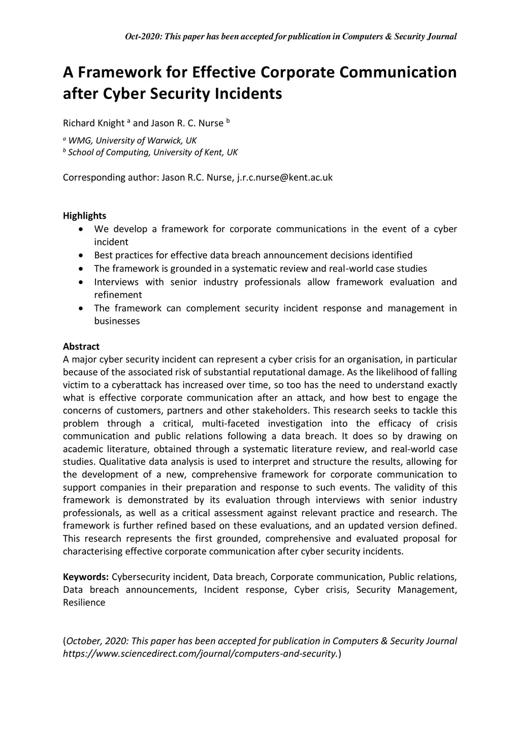 A major cyber security incident can represent a cyber crisis for an organisation, in particular because of the associated risk of substantial reputational damage. As the likelihood of falling victim to a cyberattack has increased over time, so too has the need to understand exactly what is effective corporate communication after an attack, and how best to engage the concerns of customers, partners and other stakeholders. This research seeks to tackle this problem through a critical, multi-faceted investigation into the efficacy of crisis communication and public relations following a data breach. It does so by drawing on academic literature, obtained through a systematic literature review, and real-world case studies. Qualitative data analysis is used to interpret and structure the results, allowing for the development of a new, comprehensive framework for corporate communication to support companies in their preparation and response to such events. The validity of this framework is demonstrated by its evaluation through interviews with senior industry professionals, as well as a critical assessment against relevant practice and research. The framework is further refined based on these evaluations, and an updated version defined. This research represents the first grounded, comprehensive and evaluated proposal for characterising effective corporate communication after cyber security incidents.