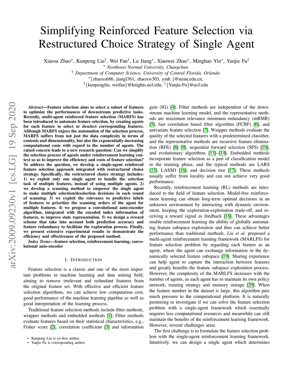 Feature selection aims to select a subset of features to optimize the performances of downstream predictive tasks. Recently, multi-agent reinforced feature selection (MARFS) has been introduced to automate feature selection, by creating agents for each feature to select or deselect corresponding features. Although MARFS enjoys the automation of the selection process, MARFS suffers from not just the data complexity in terms of contents and dimensionality, but also the exponentially-increasing computational costs with regard to the number of agents. The raised concern leads to a new research question: Can we simplify the selection process of agents under reinforcement learning context so as to improve the efficiency and costs of feature selection? To address the question, we develop a single-agent reinforced feature selection approach integrated with restructured choice strategy. Specifically, the restructured choice strategy includes: 1) we exploit only one single agent to handle the selection task of multiple features, instead of using multiple agents. 2) we develop a scanning method to empower the single agent to make multiple selection/deselection decisions in each round of scanning. 3) we exploit the relevance to predictive labels of features to prioritize the scanning orders of the agent for multiple features. 4) we propose a convolutional auto-encoder algorithm, integrated with the encoded index information of features, to improve state representation. 5) we design a reward scheme that take into account both prediction accuracy and feature redundancy to facilitate the exploration process. Finally, we present extensive experimental results to demonstrate the efficiency and effectiveness of the proposed method.