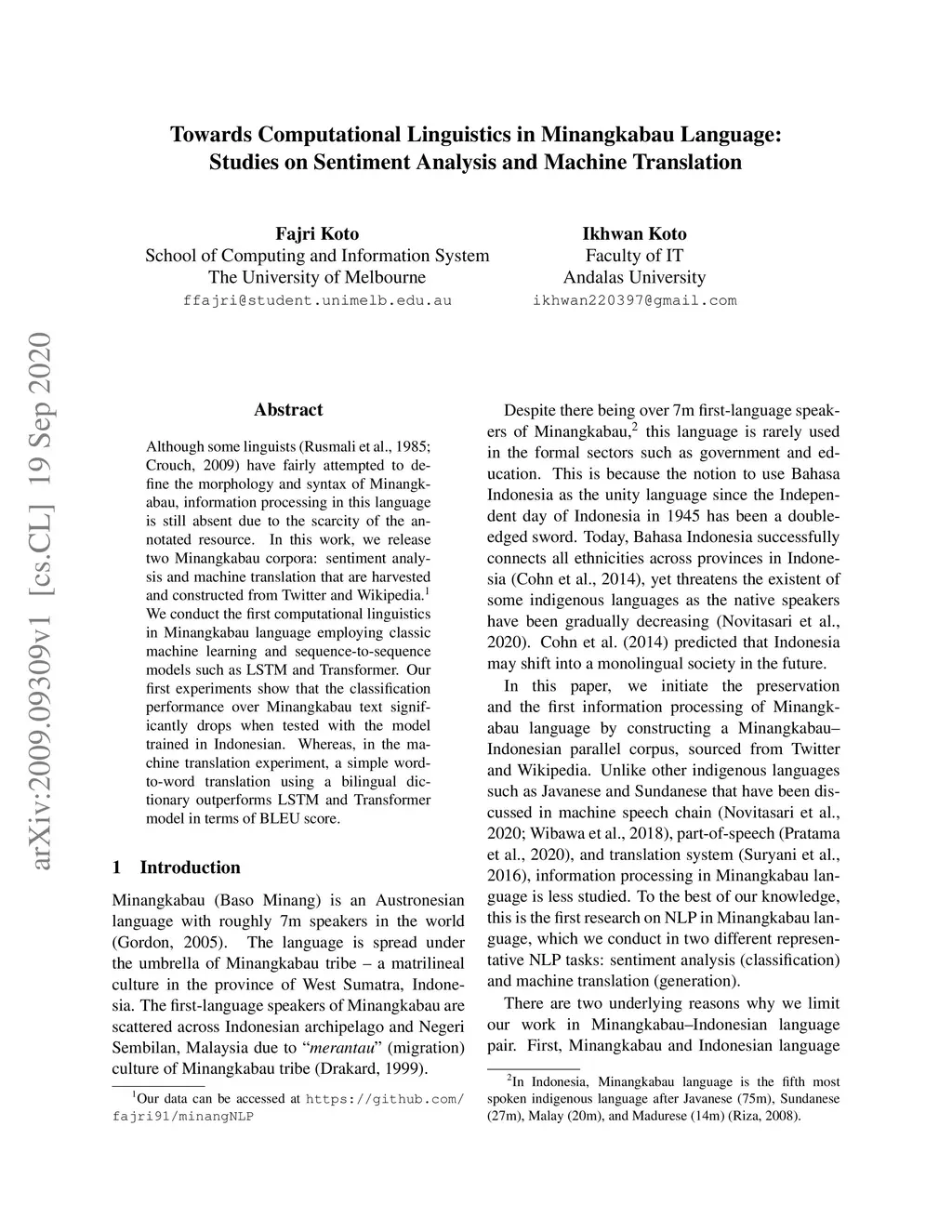 Although some linguists (Rusmali et al., 1985; Crouch, 2009) have fairly attempted to define the morphology and syntax of Minangkabau, information processing in this language is still absent due to the scarcity of the annotated resource. In this work, we release two Minangkabau corpora: sentiment analysis and machine translation that are harvested and constructed from Twitter and Wikipedia. We conduct the first computational linguistics in Minangkabau language employing classic machine learning and sequence-to-sequence models such as LSTM and Transformer. Our first experiments show that the classification performance over Minangkabau text significantly drops when tested with the model trained in Indonesian. Whereas, in the machine translation experiment, a simple word-to-word translation using a bilingual dictionary outperforms LSTM and Transformer model in terms of BLEU score.