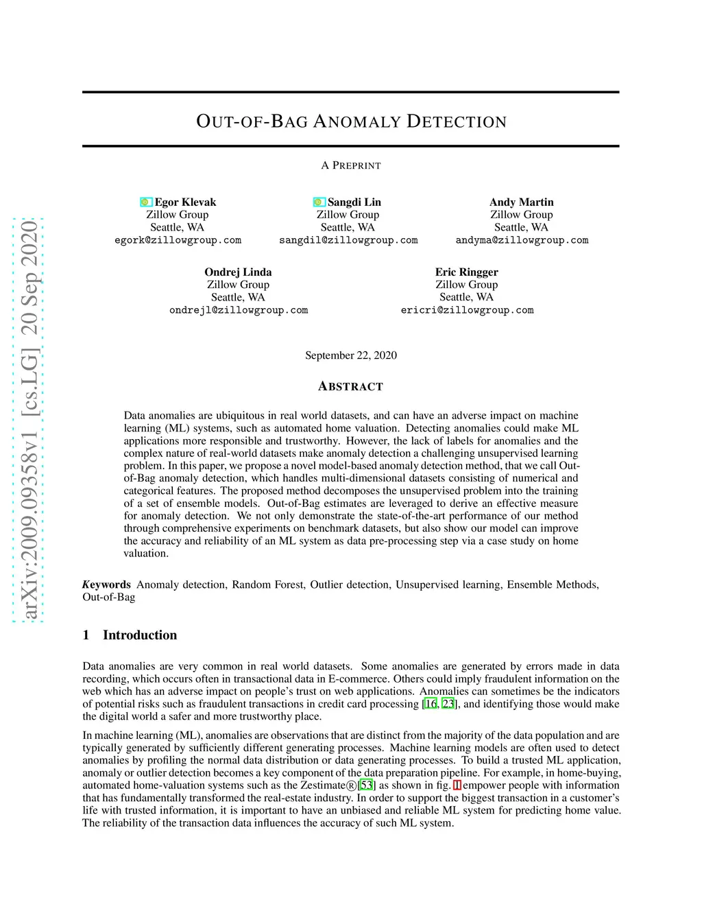 Data anomalies are ubiquitous in real world datasets, and can have an adverse impact on machine learning (ML) systems, such as automated home valuation. Detecting anomalies could make ML applications more responsible and trustworthy. However, the lack of labels for anomalies and the complex nature of real-world datasets make anomaly detection a challenging unsupervised learning problem. In this paper, we propose a novel model-based anomaly detection method, that we call Out-of- Bag anomaly detection, which handles multi-dimensional datasets consisting of numerical and categorical features. The proposed method decomposes the unsupervised problem into the training of a set of ensemble models. Out-of-Bag estimates are leveraged to derive an effective measure for anomaly detection. We not only demonstrate the state-of-the-art performance of our method through comprehensive experiments on benchmark datasets, but also show our model can improve the accuracy and reliability of an ML system as data pre-processing step via a case study on home valuation.