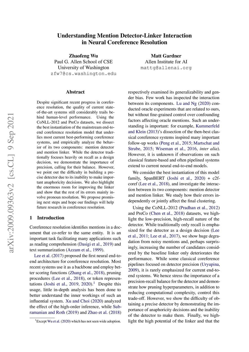 Despite significant recent progress in coreference resolution, the quality of current state-of-the-art systems still considerably trails behind human-level performance. Using the CoNLL-2012 and PreCo datasets, we dissect the best instantiation of the mainstream end-to-end coreference resolution model that underlies most current best-performing coreference systems, and empirically analyze the behavior of its two components: mention detector and mention linker. While the detector traditionally focuses heavily on recall as a design decision, we demonstrate the importance of precision, calling for their balance. However, we point out the difficulty in building a precise detector due to its inability to make important anaphoricity decisions. We also highlight the enormous room for improving the linker and show that the rest of its errors mainly involve pronoun resolution. We propose promising next steps and hope our findings will help future research in coreference resolution.