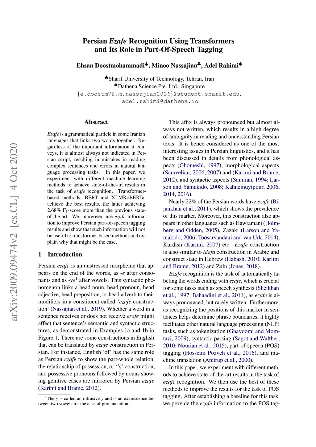 Persian Ezafe Recognition Using Transformers and Its Role in
