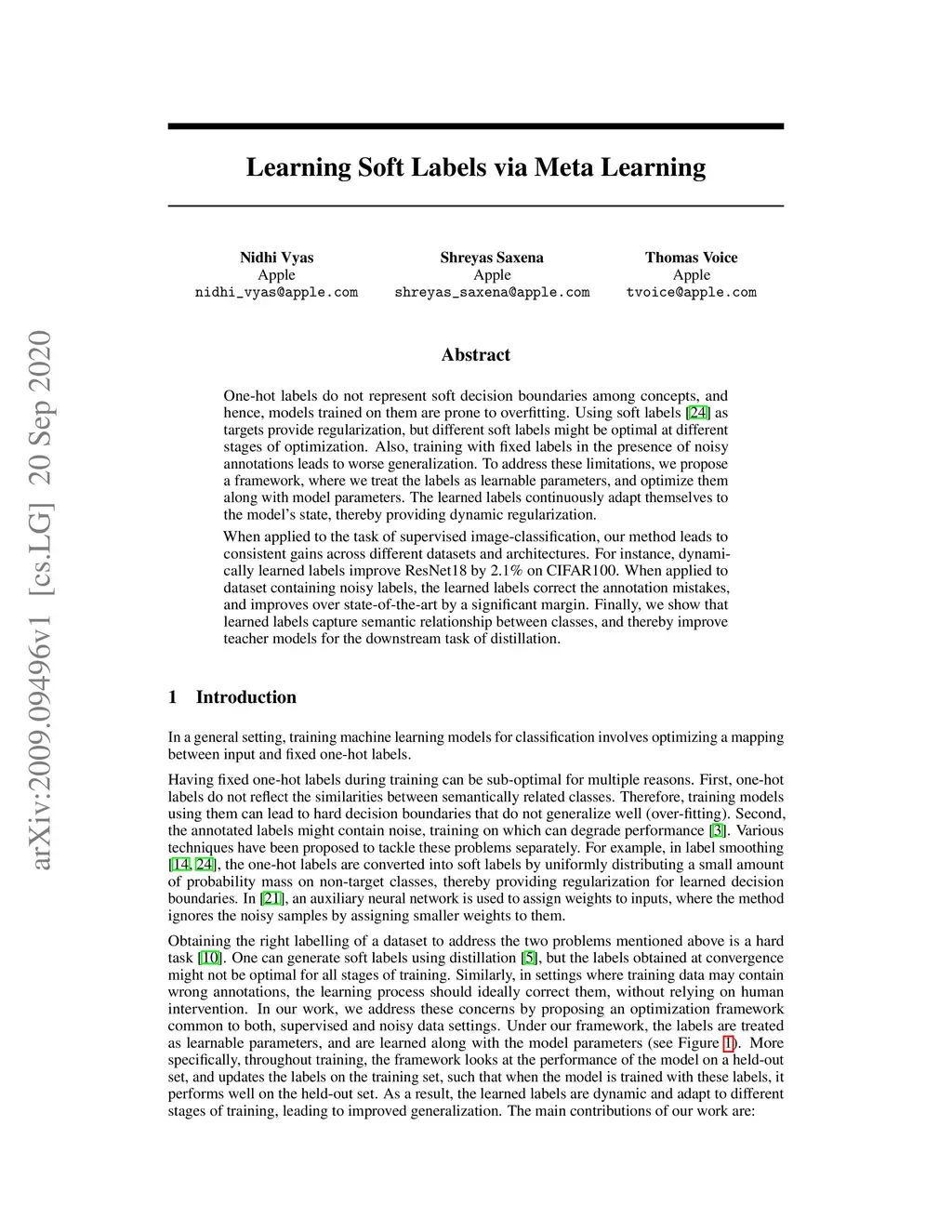 One-hot labels do not represent soft decision boundaries among concepts, and hence, models trained on them are prone to overfitting. Using soft labels as targets provide regularization, but different soft labels might be optimal at different stages of optimization. Also, training with fixed labels in the presence of noisy annotations leads to worse generalization. To address these limitations, we propose a framework, where we treat the labels as learnable parameters, and optimize them along with model parameters. The learned labels continuously adapt themselves to the model's state, thereby providing dynamic regularization. When applied to the task of supervised image-classification, our method leads to consistent gains across different datasets and architectures. For instance, dynamically learned labels improve ResNet18 by 2.1% on CIFAR100. When applied to dataset containing noisy labels, the learned labels correct the annotation mistakes, and improves over state-of-the-art by a significant margin. Finally, we show that learned labels capture semantic relationship between classes, and thereby improve teacher models for the downstream task of distillation.