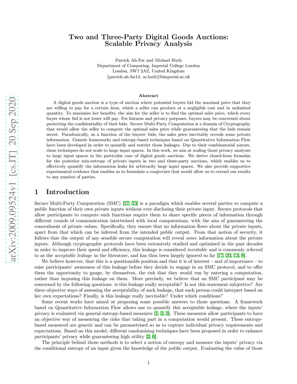 Two and Three-Party Digital Goods Auctions: Scalable Privacy Analysis
