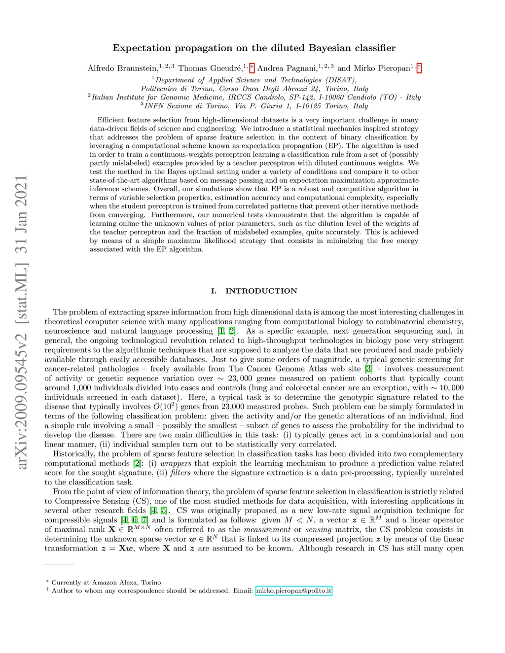 Expectation propagation on the diluted Bayesian classifier