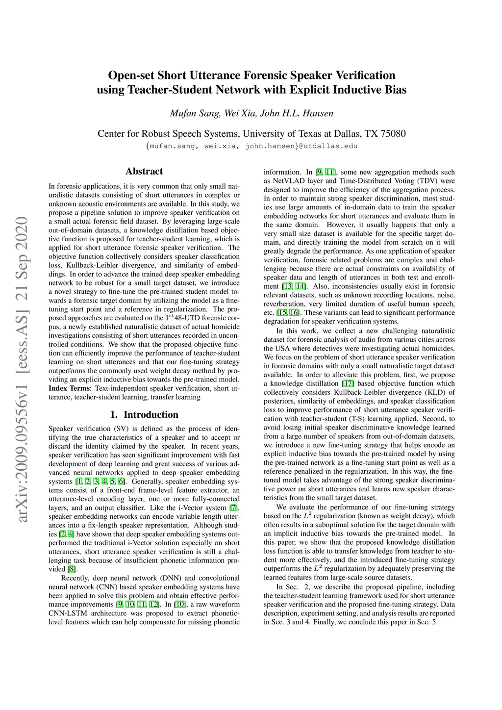 In forensic applications, it is very common that only small naturalistic datasets consisting of short utterances in complex or unknown acoustic environments are available. In this study, we propose a pipeline solution to improve speaker verification on a small actual forensic field dataset. By leveraging large-scale out-of-domain datasets, a knowledge distillation based objective function is proposed for teacher-student learning, which is applied for short utterance forensic speaker verification. The objective function collectively considers speaker classification loss, Kullback-Leibler divergence, and similarity of embeddings. In order to advance the trained deep speaker embedding network to be robust for a small target dataset, we introduce a novel strategy to fine-tune the pre-trained student model towards a forensic target domain by utilizing the model as a finetuning start point and a reference in regularization. The proposed approaches are evaluated on the 1st48-UTD forensic corpus, a newly established naturalistic dataset of actual homicide investigations consisting of short utterances recorded in uncontrolled conditions. We show that the proposed objective function can efficiently improve the performance of teacher-student learning on short utterances and that our fine-tuning strategy outperforms the commonly used weight decay method by providing an explicit inductive bias towards the pre-trained model.