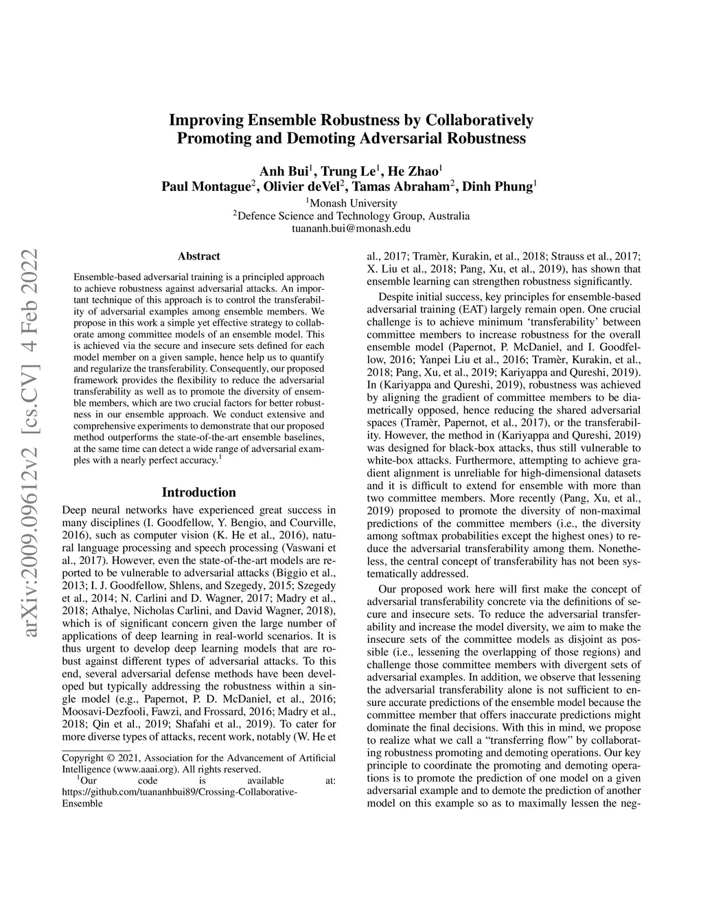 Ensemble-based adversarial training is a principled approach to achieve robustness against adversarial attacks. An important technique of this approach is to control the transferability of adversarial examples among ensemble members. We propose in this work a simple yet effective strategy to collaborate among committee models of an ensemble model. This is achieved via the secure and insecure sets defined for each model member on a given sample, hence help us to quantify and regularize the transferability. Consequently, our proposed framework provides the flexibility to reduce the adversarial transferability as well as to promote the diversity of ensemble members, which are two crucial factors for better robustness in our ensemble approach. We conduct extensive and comprehensive experiments to demonstrate that our proposed method outperforms the state-of-the-art ensemble baselines, at the same time can detect a wide range of adversarial examples with a nearly perfect accuracy. Our code is available at: https://github.com/tuananhbui89/Crossing-Collaborative-Ensemble.