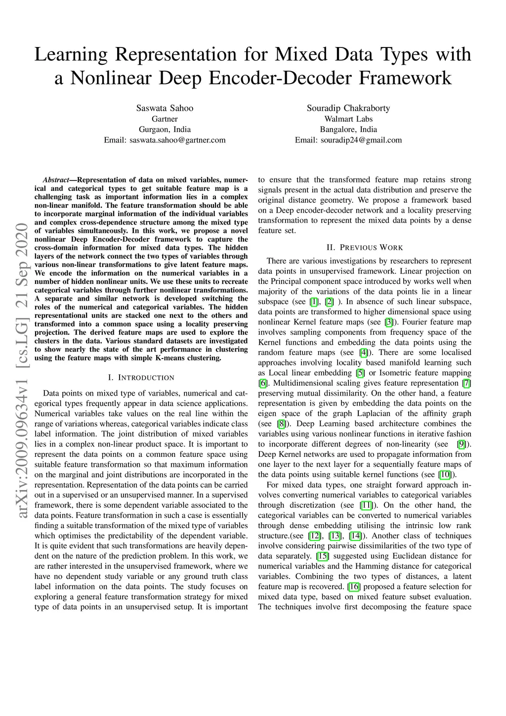 Representation of data on mixed variables, numerical and categorical types to get suitable feature map is a challenging task as important information lies in a complex non-linear manifold. The feature transformation should be able to incorporate marginal information of the individual variables and complex cross-dependence structure among the mixed type of variables simultaneously. In this work, we propose a novel nonlinear Deep Encoder-Decoder framework to capture the cross-domain information for mixed data types. The hidden layers of the network connect the two types of variables through various non-linear transformations to give latent feature maps. We encode the information on the numerical variables in a number of hidden nonlinear units. We use these units to recreate categorical variables through further nonlinear transformations. A separate and similar network is developed switching the roles of the numerical and categorical variables. The hidden representational units are stacked one next to the others and transformed into a common space using a locality preserving projection. The derived feature maps are used to explore the clusters in the data. Various standard datasets are investigated to show nearly the state of the art performance in clustering using the feature maps with simple K-means clustering.