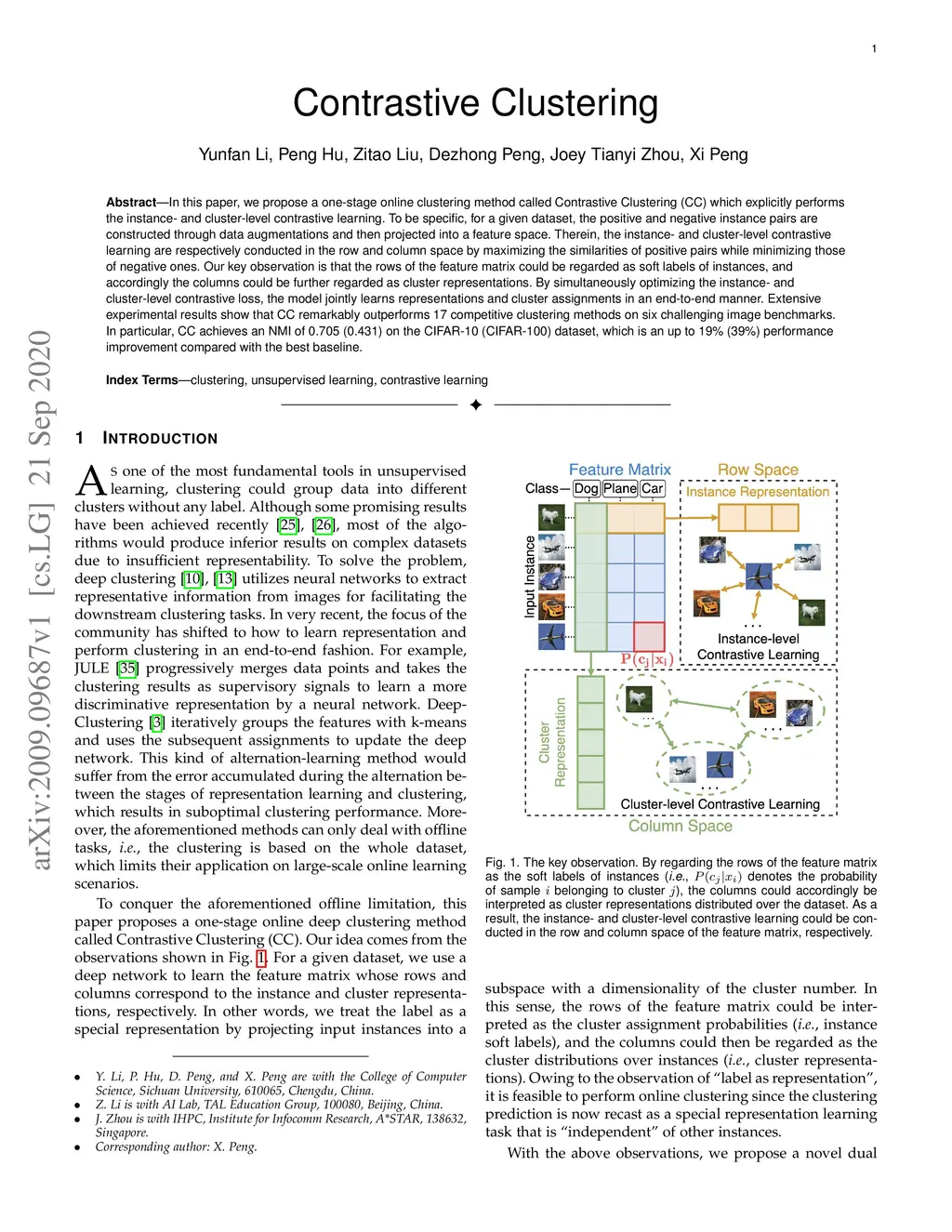 In this paper, we propose a one-stage online clustering method called Contrastive Clustering (CC) which explicitly performs the instance- and cluster-level contrastive learning. To be specific, for a given dataset, the positive and negative instance pairs are constructed through data augmentations and then projected into a feature space. Therein, the instance- and cluster-level contrastive learning are respectively conducted in the row and column space by maximizing the similarities of positive pairs while minimizing those of negative ones. Our key observation is that the rows of the feature matrix could be regarded as soft labels of instances, and accordingly the columns could be further regarded as cluster representations. By simultaneously optimizing the instance- and cluster-level contrastive loss, the model jointly learns representations and cluster assignments in an end-to-end manner. Extensive experimental results show that CC remarkably outperforms 17 competitive clustering methods on six challenging image benchmarks. In particular, CC achieves an NMI of 0.705 (0.431) on the CIFAR-10 (CIFAR-100) dataset, which is an up to 19\% (39\%) performance improvement compared with the best baseline.
