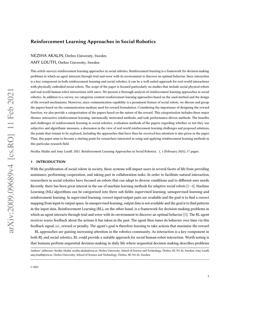 This article surveys reinforcement learning (RL) approaches in social robotics. RL is a framework for decision-making problems in which an agent interacts through trial-and-error with its environment to discover an optimal behavior. Since interaction is a key component in both RL and social robotics, it can be a well-suited approach for real-world interactions with physically embodied social robots. The scope of the paper is focused particularly on studies that include social physical robots and real-world human-robot interactions with users. In addition to a survey, we categorize existent RL approaches based on the design of the reward mechanisms. This categorization includes three major themes: interactive reinforcement learning, intrinsically motivated methods, and task performance-driven methods. Thus, this paper aims to become a starting point for researchers interested to use and apply reinforcement learning methods in this particular research field.