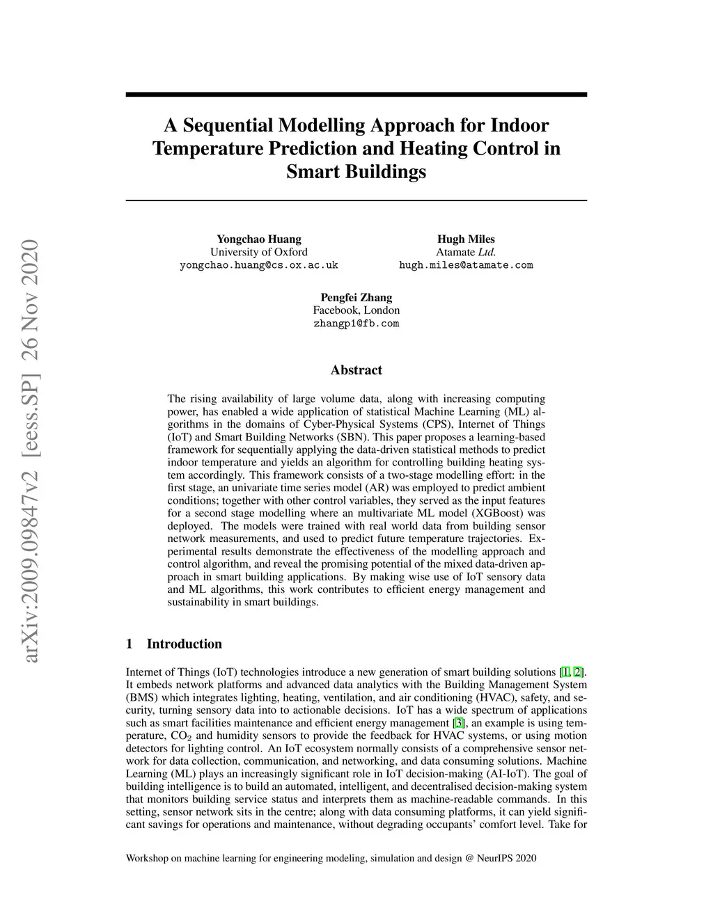 The rising availability of large volume data, along with increasing computing power, has enabled a wide application of statistical Machine Learning (ML) algorithms in the domains of Cyber-Physical Systems (CPS), Internet of Things (IoT) and Smart Building Networks (SBN). This paper proposes a learning-based framework for sequentially applying the data-driven statistical methods to predict indoor temperature and yields an algorithm for controlling building heating system accordingly. This framework consists of a two-stage modelling effort: in the first stage, an univariate time series model (AR) was employed to predict ambient conditions; together with other control variables, they served as the input features for a second stage modelling where an multivariate ML model (XGBoost) was deployed. The models were trained with real world data from building sensor network measurements, and used to predict future temperature trajectories. Experimental results demonstrate the effectiveness of the modelling approach and control algorithm, and reveal the promising potential of the mixed data-driven approach in smart building applications. By making wise use of IoT sensory data and ML algorithms, this work contributes to efficient energy management and sustainability in smart buildings.