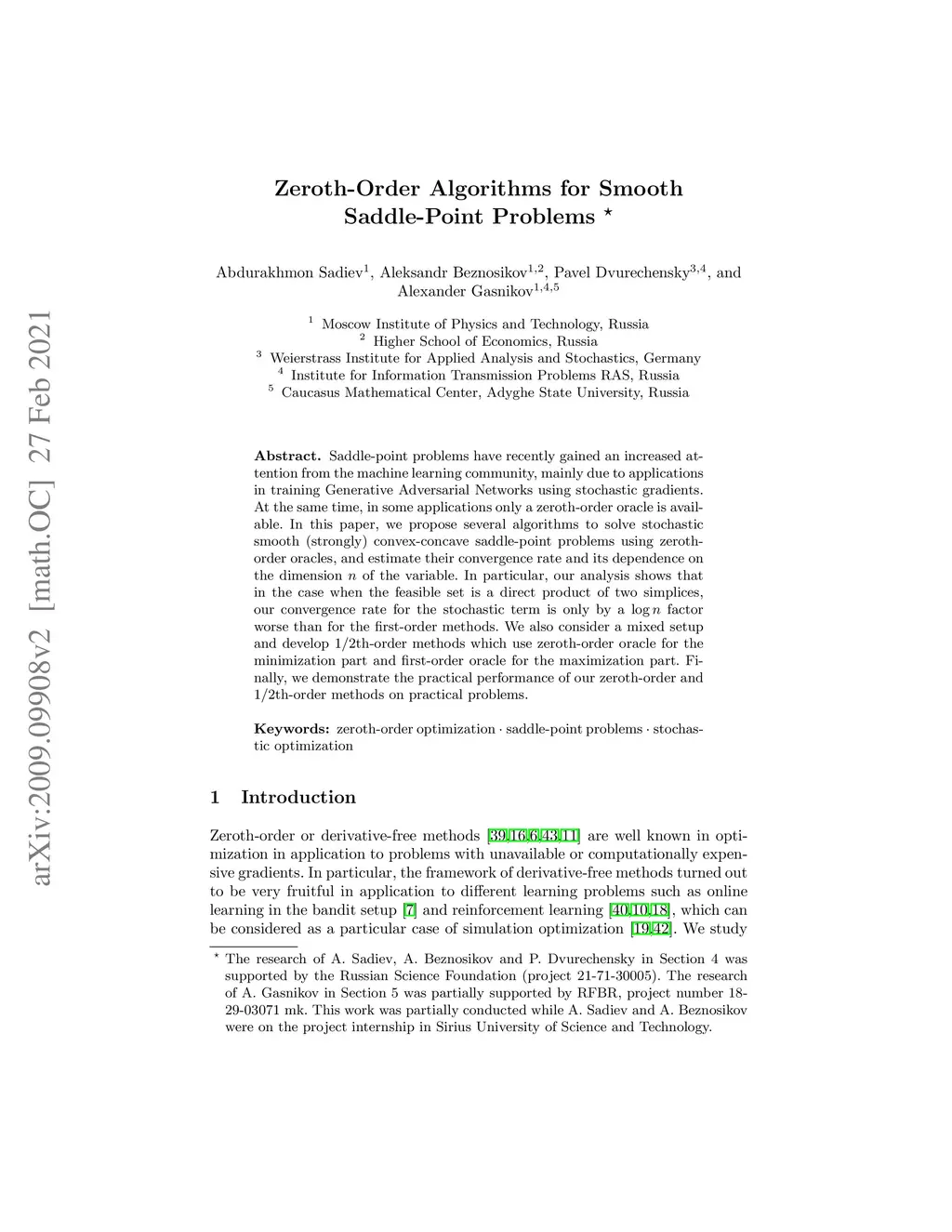 Saddle-point problems have recently gained increased attention from the machine learning community, mainly due to applications in training Generative Adversarial Networks using stochastic gradients. At the same time, in some applications only a zeroth-order oracle is available. In this paper, we propose several algorithms to solve stochastic smooth (strongly) convex-concave saddle-point problems using zeroth-order oracles and estimate their convergence rate and its dependence on the dimension of the variable. In particular, our analysis shows that in the case when the feasible set is a direct product of two simplices, our convergence rate for the stochastic term is only by a factor worse than for the first-order methods. We also consider a mixed setup and develop 1/2th-order methods that use zeroth-order oracle for the minimization part and first-order oracle for the maximization part. Finally, we demonstrate the practical performance of our zeroth-order and 1/2th-order methods on practical problems.