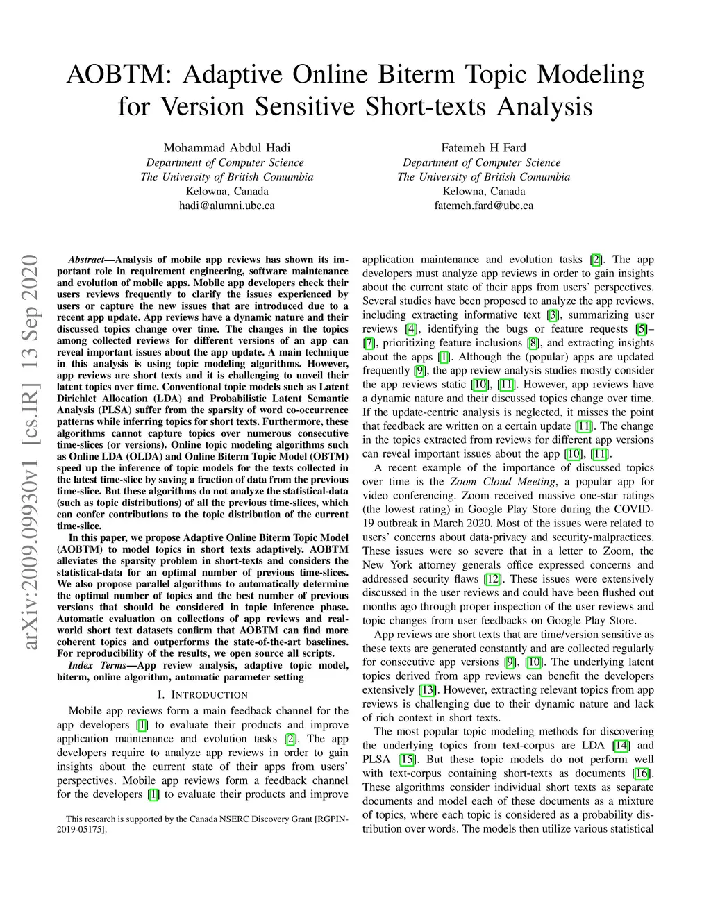 AOBTM: Adaptive Online Biterm Topic Modeling for Version Sensitive