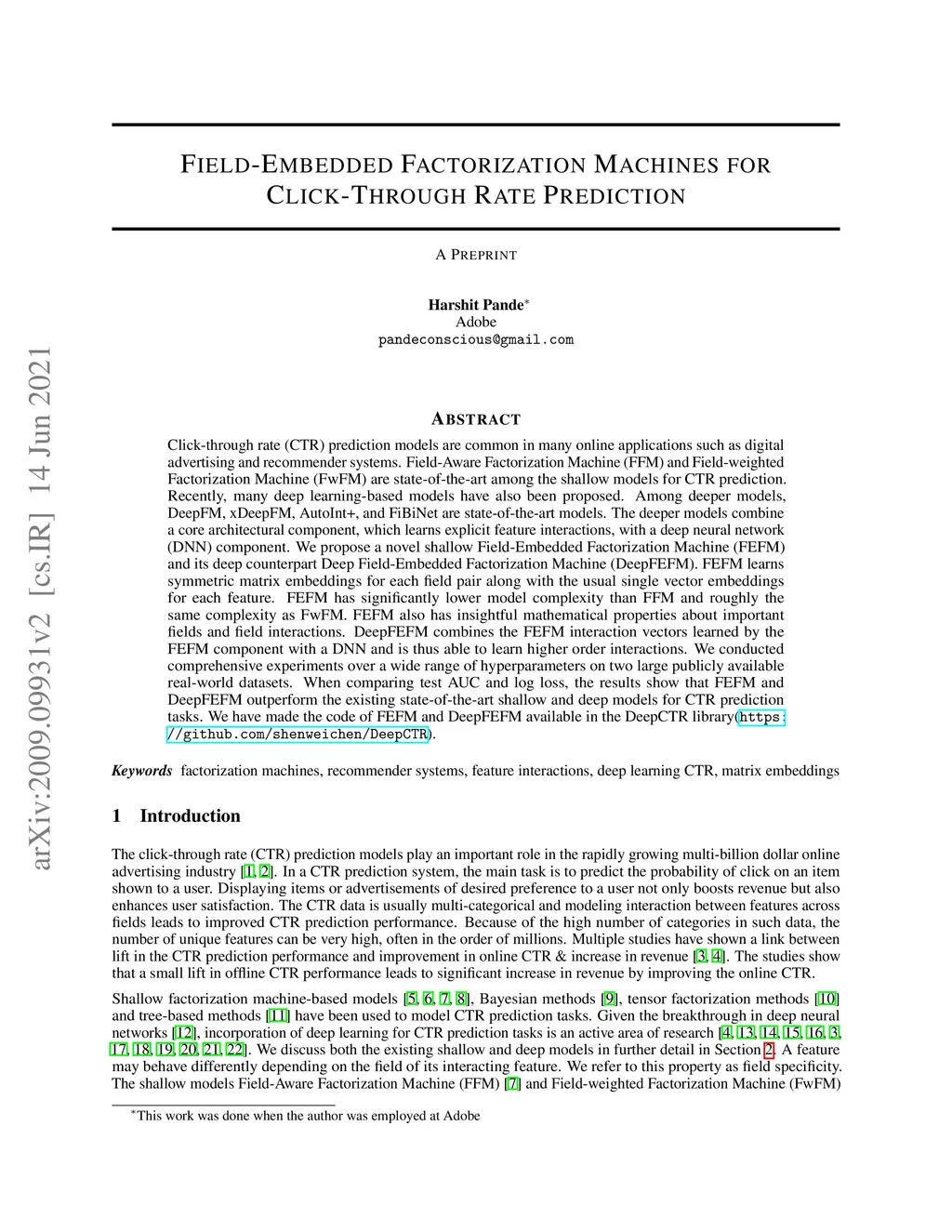 Field-Embedded Factorization Machines for Click-through rate prediction