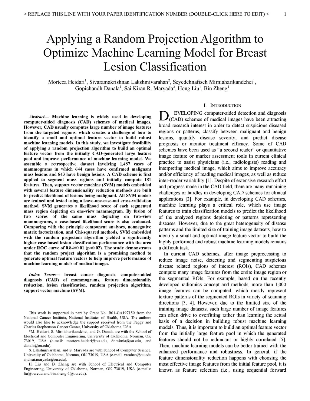 Machine learning is widely used in developing computer-aided diagnosis (CAD) schemes of medical images. However, CAD usually computes large number of image features from the targeted regions, which creates a challenge of how to identify a small and optimal feature vector to build robust machine learning models. In this study, we investigate feasibility of applying a random projection algorithm to build an optimal feature vector from the initially CAD-generated large feature pool and improve performance of machine learning model. We assemble a retrospective dataset involving 1,487 cases of mammograms in which 644 cases have confirmed malignant mass lesions and 843 have benign lesions. A CAD scheme is first applied to segment mass regions and initially compute 181 features. Then, support vector machine (SVM) models embedded with several feature dimensionality reduction methods are built to predict likelihood of lesions being malignant. All SVM models are trained and tested using a leave-one-case-out cross-validation method. SVM generates a likelihood score of each segmented mass region depicting on one-view mammogram. By fusion of two scores of the same mass depicting on two-view mammograms, a case-based likelihood score is also evaluated. Comparing with the principle component analyses, nonnegative matrix factorization, and Chi-squared methods, SVM embedded with the random projection algorithm yielded a significantly higher case-based lesion classification performance with the area under ROC curve of 0.84+0.01 (p<0.02). The study demonstrates that the random project algorithm is a promising method to generate optimal feature vectors to help improve performance of machine learning models of medical images.