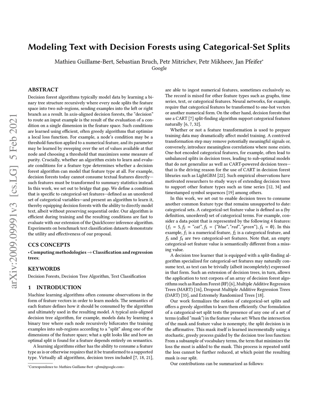 Modeling Text with Decision Forests using Categorical-Set Splits