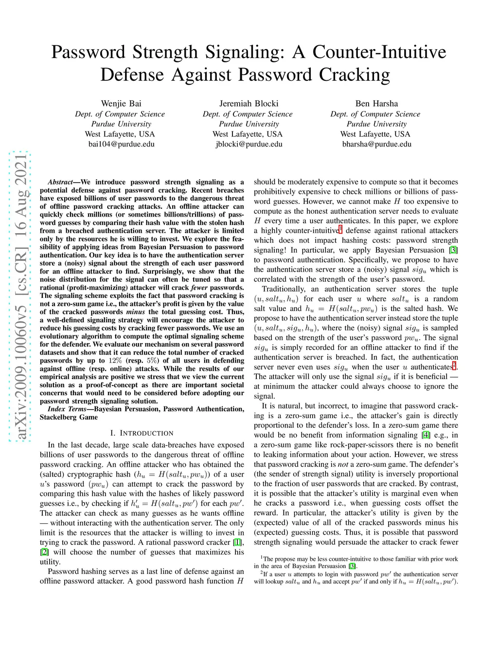 We introduce password strength information signaling as a novel, yet counter-intuitive, defense mechanism against password cracking attacks. Recent breaches have exposed billions of user passwords to the dangerous threat of offline password cracking attacks. An offline attacker can quickly check millions (or sometimes billions/trillions) of password guesses by comparing their hash value with the stolen hash from a breached authentication server. The attacker is limited only by the resources he is willing to invest. Our key idea is to have the authentication server store a (noisy) signal about the strength of each user password for an offline attacker to find. Surprisingly, we show that the noise distribution for the signal can often be tuned so that a rational (profit-maximizing) attacker will crack fewer passwords. The signaling scheme exploits the fact that password cracking is not a zero-sum game i.e., the attacker's profit is given by the value of the cracked passwords minus the total guessing cost. Thus, a well-defined signaling strategy will encourage the attacker to reduce his guessing costs by cracking fewer passwords. We use an evolutionary algorithm to compute the optimal signaling scheme for the defender. As a proof-of-concept, we evaluate our mechanism on several password datasets and show that it can reduce the total number of cracked passwords by up to (resp. ) of all users in defending against offline (resp. online) attacks.
