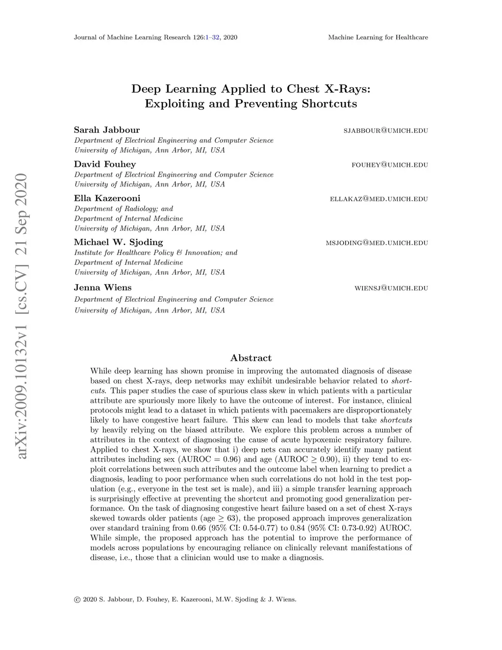 While deep learning has shown promise in improving the automated diagnosis of disease based on chest X-rays, deep networks may exhibit undesirable behavior related to shortcuts. This paper studies the case of spurious class skew in which patients with a particular attribute are spuriously more likely to have the outcome of interest. For instance, clinical protocols might lead to a dataset in which patients with pacemakers are disproportionately likely to have congestive heart failure. This skew can lead to models that take shortcuts by heavily relying on the biased attribute. We explore this problem across a number of attributes in the context of diagnosing the cause of acute hypoxemic respiratory failure. Applied to chest X-rays, we show that i) deep nets can accurately identify many patient attributes including sex (AUROC = 0.96) and age (AUROC >= 0.90), ii) they tend to exploit correlations between such attributes and the outcome label when learning to predict a diagnosis, leading to poor performance when such correlations do not hold in the test population (e.g., everyone in the test set is male), and iii) a simple transfer learning approach is surprisingly effective at preventing the shortcut and promoting good generalization performance. On the task of diagnosing congestive heart failure based on a set of chest X-rays skewed towards older patients (age >= 63), the proposed approach improves generalization over standard training from 0.66 (95% CI: 0.54-0.77) to 0.84 (95% CI: 0.73-0.92) AUROC. While simple, the proposed approach has the potential to improve the performance of models across populations by encouraging reliance on clinically relevant manifestations of disease, i.e., those that a clinician would use to make a diagnosis.
