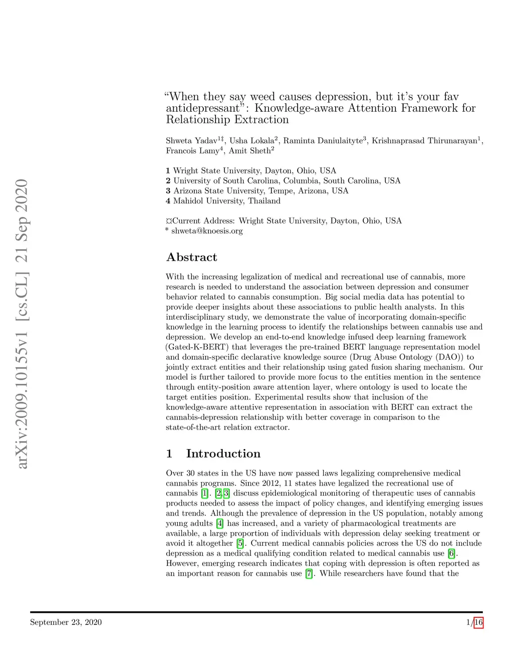With the increasing legalization of medical and recreational use of cannabis, more research is needed to understand the association between depression and consumer behavior related to cannabis consumption. Big social media data has potential to provide deeper insights about these associations to public health analysts. In this interdisciplinary study, we demonstrate the value of incorporating domain-specific knowledge in the learning process to identify the relationships between cannabis use and depression. We develop an end-to-end knowledge infused deep learning framework (Gated-K-BERT) that leverages the pre-trained BERT language representation model and domain-specific declarative knowledge source (Drug Abuse Ontology (DAO)) to jointly extract entities and their relationship using gated fusion sharing mechanism. Our model is further tailored to provide more focus to the entities mention in the sentence through entity-position aware attention layer, where ontology is used to locate the target entities position. Experimental results show that inclusion of the knowledge-aware attentive representation in association with BERT can extract the cannabis-depression relationship with better coverage in comparison to the state-of-the-art relation extractor.
