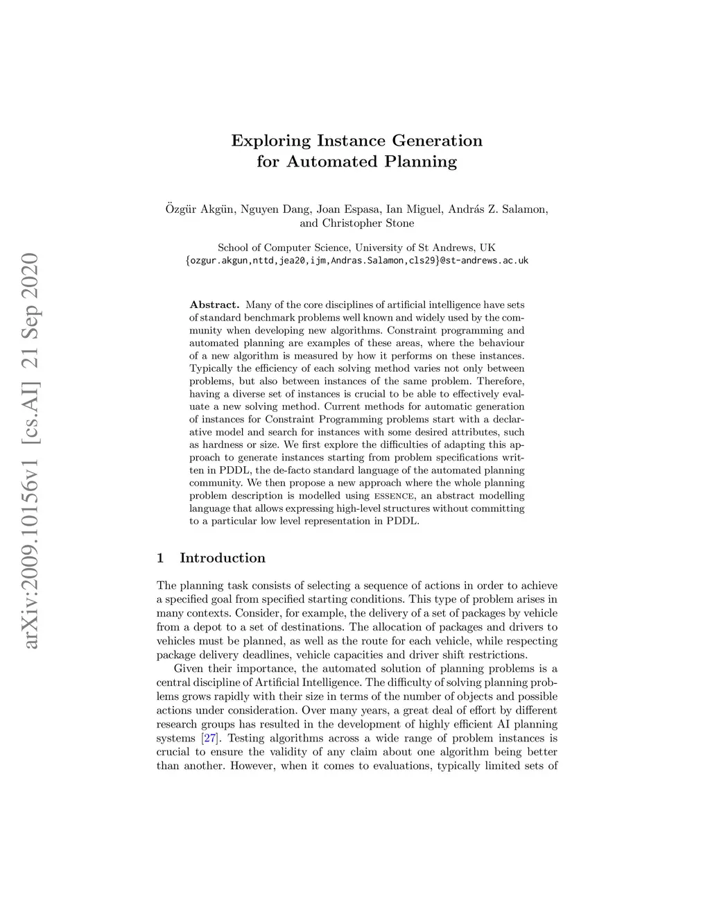 Many of the core disciplines of artificial intelligence have sets of standard benchmark problems well known and widely used by the community when developing new algorithms. Constraint programming and automated planning are examples of these areas, where the behaviour of a new algorithm is measured by how it performs on these instances. Typically the efficiency of each solving method varies not only between problems, but also between instances of the same problem. Therefore, having a diverse set of instances is crucial to be able to effectively evaluate a new solving method. Current methods for automatic generation of instances for Constraint Programming problems start with a declarative model and search for instances with some desired attributes, such as hardness or size. We first explore the difficulties of adapting this approach to generate instances starting from problem specifications written in PDDL, the de-facto standard language of the automated planning community. We then propose a new approach where the whole planning problem description is modelled using Essence, an abstract modelling language that allows expressing high-level structures without committing to a particular low level representation in PDDL.