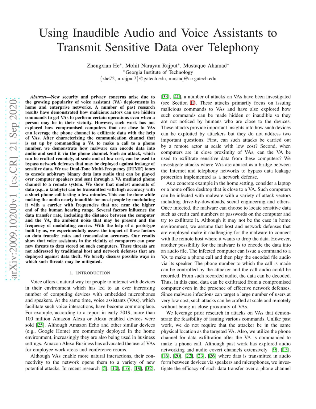 Using Inaudible Audio and Voice Assistants to Transmit Sensitive Data
