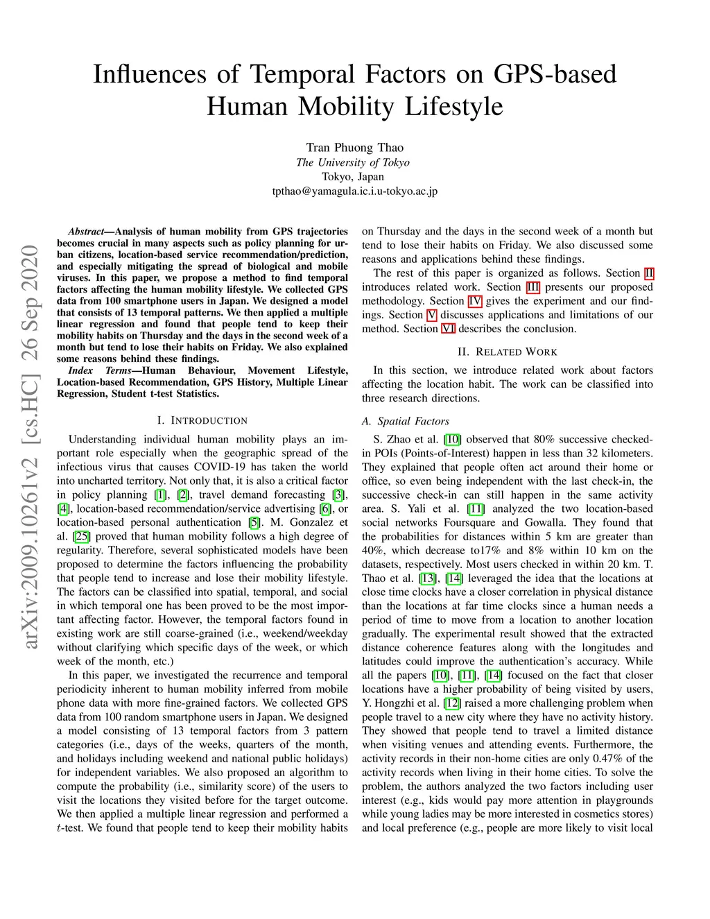 Analysis of human mobility from GPS trajectories becomes crucial in many aspects such as policy planning for urban citizens, location-based service recommendation/prediction, and especially mitigating the spread of biological and mobile viruses. In this paper, we propose a method to find temporal factors affecting the human mobility lifestyle. We collected GPS data from 100 smartphone users in Japan. We designed a model that consists of 13 temporal patterns. We then applied a multiple linear regression and found that people tend to keep their mobility habits on Thursday and the days in the second week of a month but tend to lose their habits on Friday. We also explained some reasons behind these findings.