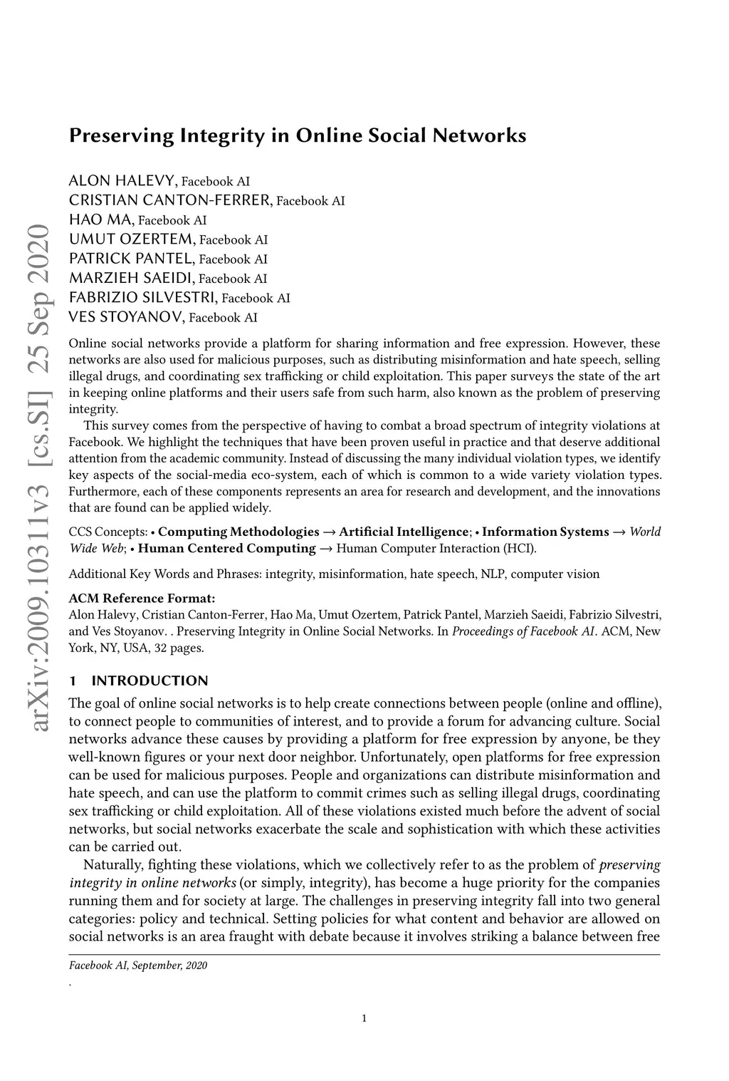 Online social networks provide a platform for sharing information and free expression. However, these networks are also used for malicious purposes, such as distributing misinformation and hate speech, selling illegal drugs, and coordinating sex trafficking or child exploitation. This paper surveys the state of the art in keeping online platforms and their users safe from such harm, also known as the problem of preserving integrity. This survey comes from the perspective of having to combat a broad spectrum of integrity violations at Facebook. We highlight the techniques that have been proven useful in practice and that deserve additional attention from the academic community. Instead of discussing the many individual violation types, we identify key aspects of the social-media eco-system, each of which is common to a wide variety violation types. Furthermore, each of these components represents an area for research and development, and the innovations that are found can be applied widely.