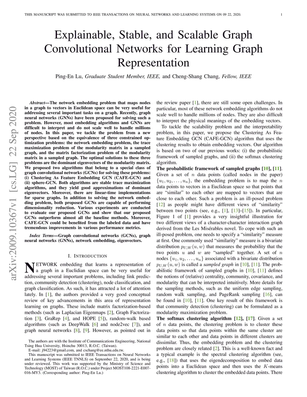The network embedding problem that maps nodes in a graph to vectors in Euclidean space can be very useful for addressing several important tasks on a graph. Recently, graph neural networks (GNNs) have been proposed for solving such a problem. However, most embedding algorithms and GNNs are difficult to interpret and do not scale well to handle millions of nodes. In this paper, we tackle the problem from a new perspective based on the equivalence of three constrained optimization problems: the network embedding problem, the trace maximization problem of the modularity matrix in a sampled graph, and the matrix factorization problem of the modularity matrix in a sampled graph. The optimal solutions to these three problems are the dominant eigenvectors of the modularity matrix. We proposed two algorithms that belong to a special class of graph convolutional networks (GCNs) for solving these problems: (i) Clustering As Feature Embedding GCN (CAFE-GCN) and (ii) sphere-GCN. Both algorithms are stable trace maximization algorithms, and they yield good approximations of dominant eigenvectors. Moreover, there are linear-time implementations for sparse graphs. In addition to solving the network embedding problem, both proposed GCNs are capable of performing dimensionality reduction. Various experiments are conducted to evaluate our proposed GCNs and show that our proposed GCNs outperform almost all the baseline methods. Moreover, CAFE-GCN could be benefited from the labeled data and have tremendous improvements in various performance metrics.
