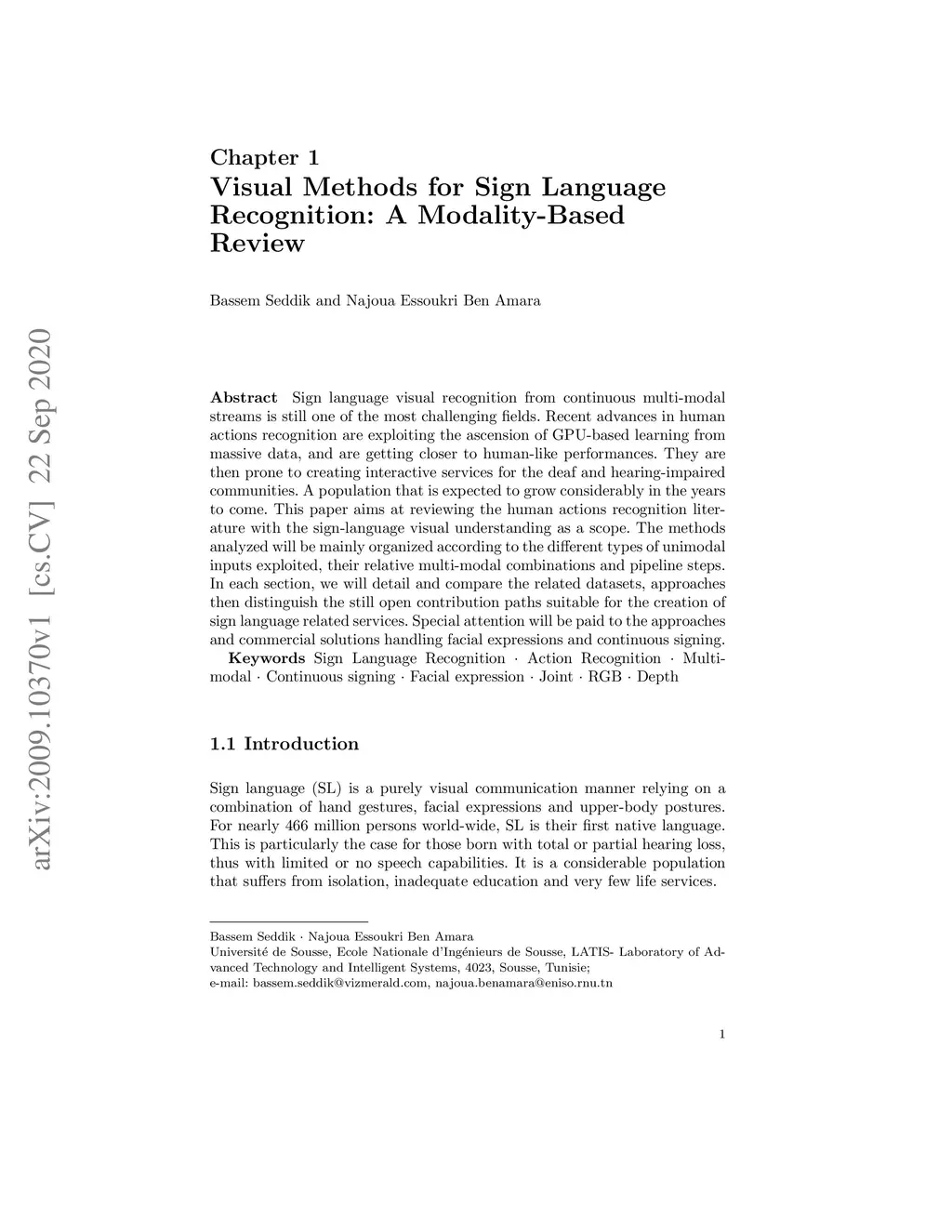Sign language visual recognition from continuous multi-modal streams is still one of the most challenging fields. Recent advances in human actions recognition are exploiting the ascension of GPU-based learning from massive data, and are getting closer to human-like performances. They are then prone to creating interactive services for the deaf and hearing-impaired communities. A population that is expected to grow considerably in the years to come. This paper aims at reviewing the human actions recognition literature with the sign-language visual understanding as a scope. The methods analyzed will be mainly organized according to the different types of unimodal inputs exploited, their relative multi-modal combinations and pipeline steps. In each section, we will detail and compare the related datasets, approaches then distinguish the still open contribution paths suitable for the creation of sign language related services. Special attention will be paid to the approaches and commercial solutions handling facial expressions and continuous signing.