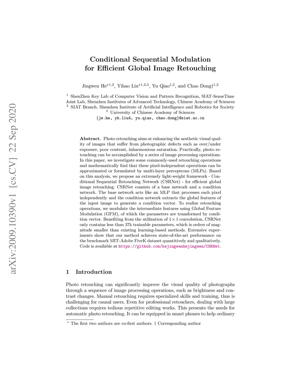 Photo retouching aims at enhancing the aesthetic visual quality of images that suffer from photographic defects such as over/under exposure, poor contrast, inharmonious saturation. Practically, photo retouching can be accomplished by a series of image processing operations. In this paper, we investigate some commonly-used retouching operations and mathematically find that these pixel-independent operations can be approximated or formulated by multi-layer perceptrons (MLPs). Based on this analysis, we propose an extremely light-weight framework - Conditional Sequential Retouching Network (CSRNet) - for efficient global image retouching. CSRNet consists of a base network and a condition network. The base network acts like an MLP that processes each pixel independently and the condition network extracts the global features of the input image to generate a condition vector. To realize retouching operations, we modulate the intermediate features using Global Feature Modulation (GFM), of which the parameters are transformed by condition vector. Benefiting from the utilization of convolution, CSRNet only contains less than 37k trainable parameters, which is orders of magnitude smaller than existing learning-based methods. Extensive experiments show that our method achieves state-of-the-art performance on the benchmark MIT-Adobe FiveK dataset quantitively and qualitatively. Code is available at https://github.com/hejingwenhejingwen/CSRNet.