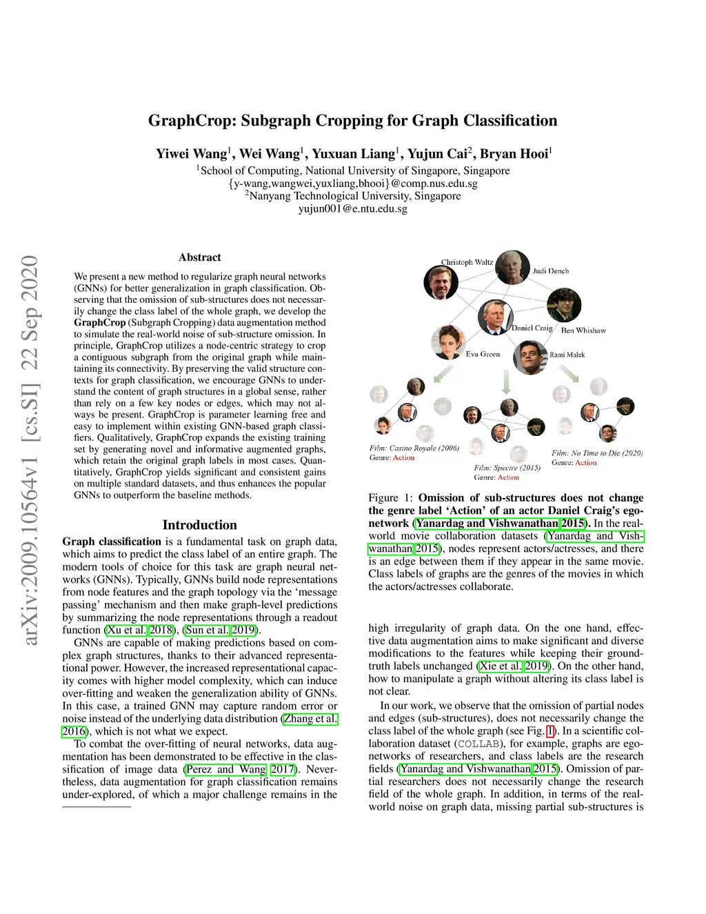 We present a new method to regularize graph neural networks (GNNs) for better generalization in graph classification. Observing that the omission of sub-structures does not necessarily change the class label of the whole graph, we develop the \textbf{GraphCrop} (Subgraph Cropping) data augmentation method to simulate the real-world noise of sub-structure omission. In principle, GraphCrop utilizes a node-centric strategy to crop a contiguous subgraph from the original graph while maintaining its connectivity. By preserving the valid structure contexts for graph classification, we encourage GNNs to understand the content of graph structures in a global sense, rather than rely on a few key nodes or edges, which may not always be present. GraphCrop is parameter learning free and easy to implement within existing GNN-based graph classifiers. Qualitatively, GraphCrop expands the existing training set by generating novel and informative augmented graphs, which retain the original graph labels in most cases. Quantitatively, GraphCrop yields significant and consistent gains on multiple standard datasets, and thus enhances the popular GNNs to outperform the baseline methods.