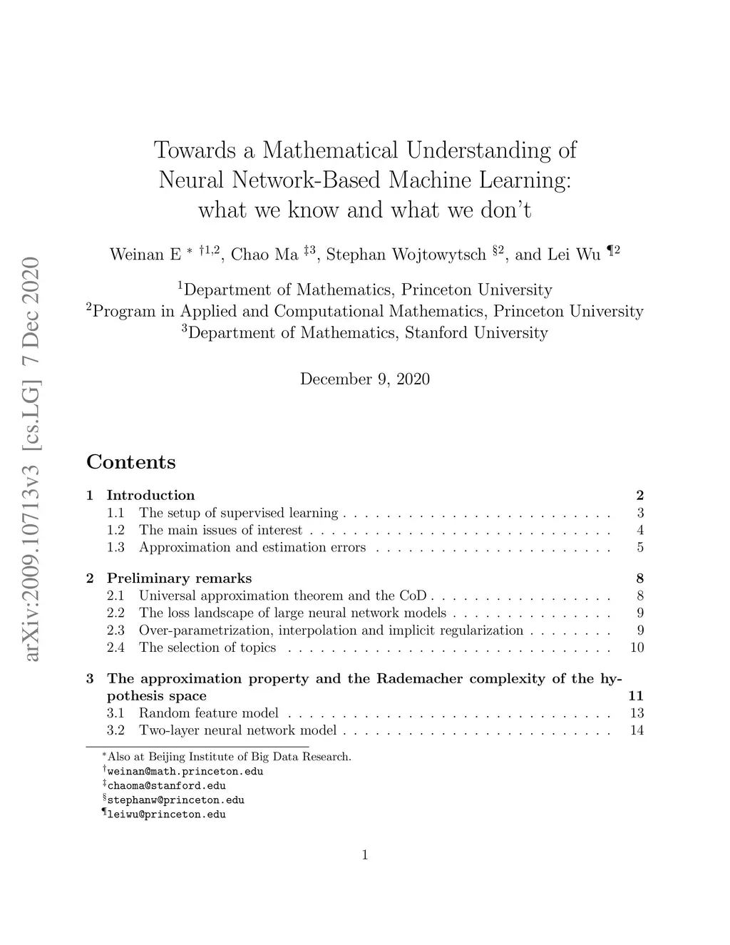 The purpose of this article is to review the achievements made in the last few years towards the understanding of the reasons behind the success and subtleties of neural network-based machine learning. In the tradition of good old applied mathematics, we will not only give attention to rigorous mathematical results, but also the insight we have gained from careful numerical experiments as well as the analysis of simplified models. Along the way, we also list the open problems which we believe to be the most important topics for further study. This is not a complete overview over this quickly moving field, but we hope to provide a perspective which may be helpful especially to new researchers in the area.