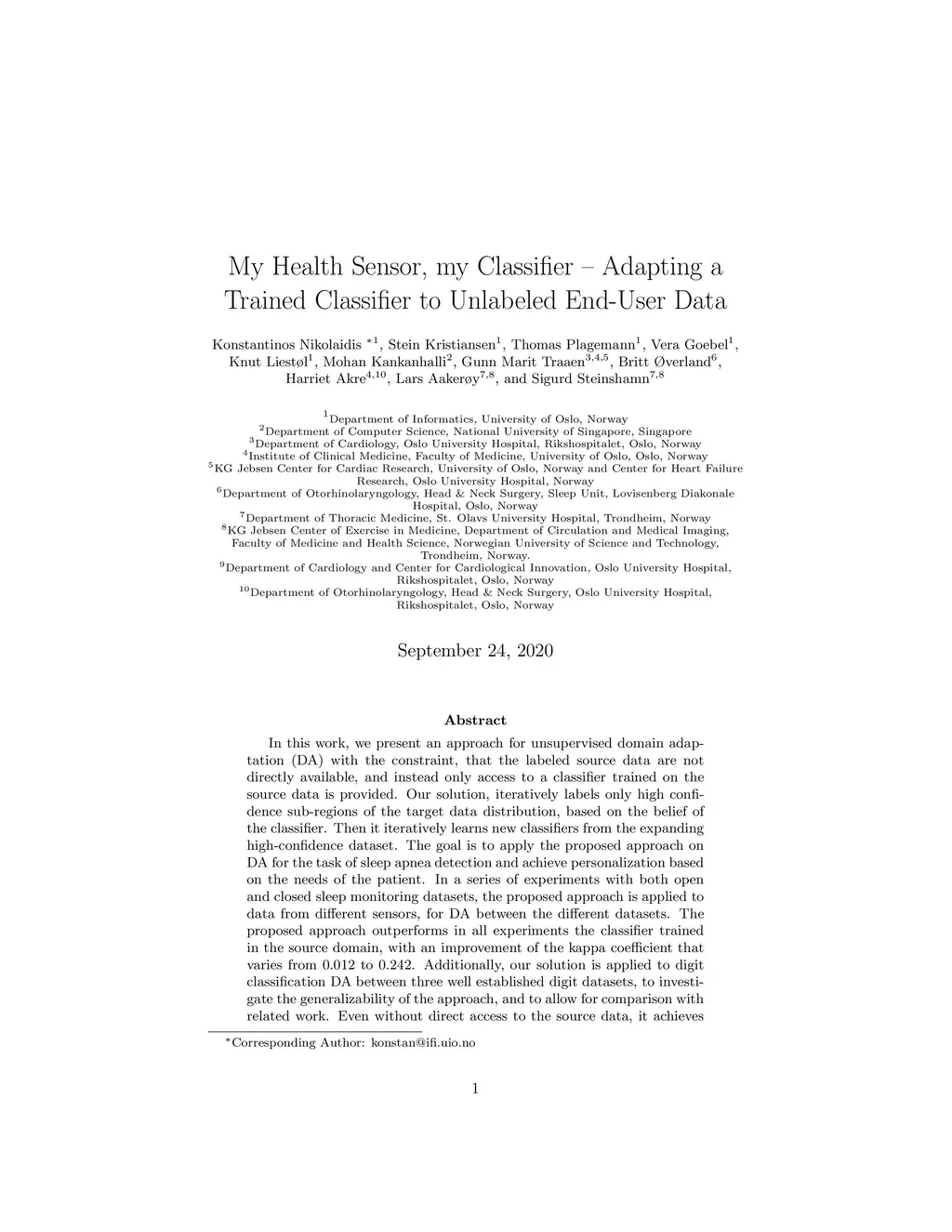 In this work, we present an approach for unsupervised domain adaptation (DA) with the constraint, that the labeled source data are not directly available, and instead only access to a classifier trained on the source data is provided. Our solution, iteratively labels only high confidence sub-regions of the target data distribution, based on the belief of the classifier. Then it iteratively learns new classifiers from the expanding high-confidence dataset. The goal is to apply the proposed approach on DA for the task of sleep apnea detection and achieve personalization based on the needs of the patient. In a series of experiments with both open and closed sleep monitoring datasets, the proposed approach is applied to data from different sensors, for DA between the different datasets. The proposed approach outperforms in all experiments the classifier trained in the source domain, with an improvement of the kappa coefficient that varies from 0.012 to 0.242. Additionally, our solution is applied to digit classification DA between three well established digit datasets, to investigate the generalizability of the approach, and to allow for comparison with related work. Even without direct access to the source data, it achieves good results, and outperforms several well established unsupervised DA methods.